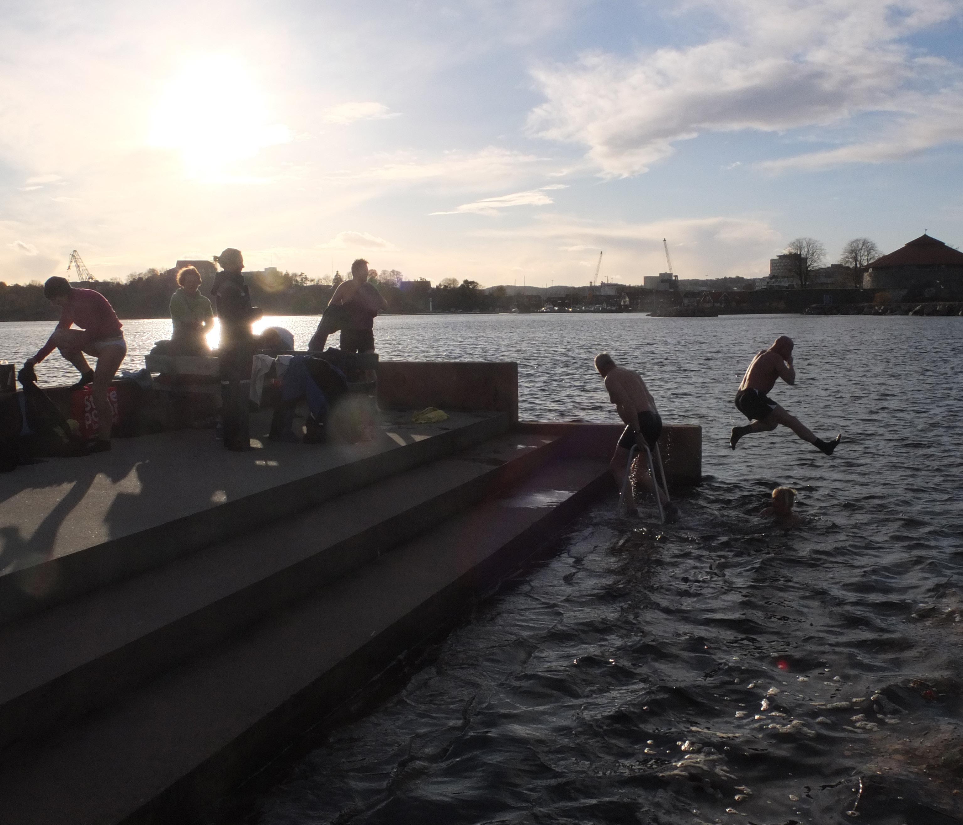 Denne vennegjengen møtes flere ganger i uka gjennom hele året for å ta seg et bad. Det kan bli heller kaldt i vinterhalvåret. Denne søndagen var vannet bare 6,6 grader.... De badende er Ellen Bjorvand, Grethe Aadland, Rune Jahnsen, Barbro Hansen, Stine B. Nilsen, Kai G. Karlsen, Tom Gundersen, Eli Johannessen. Foto: Sidsel Jørgensen