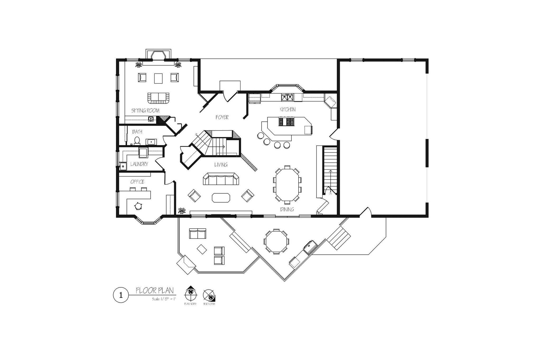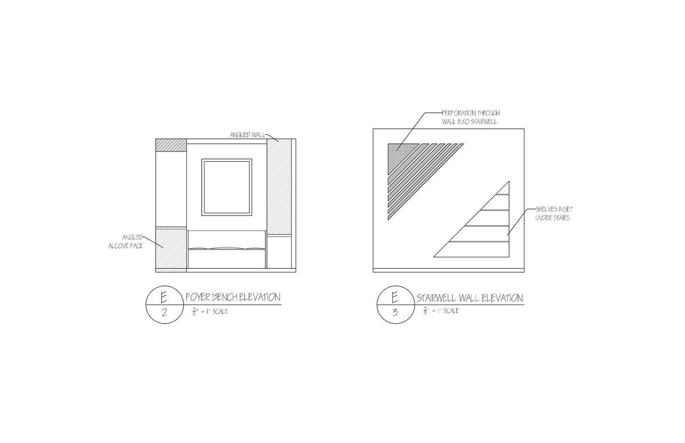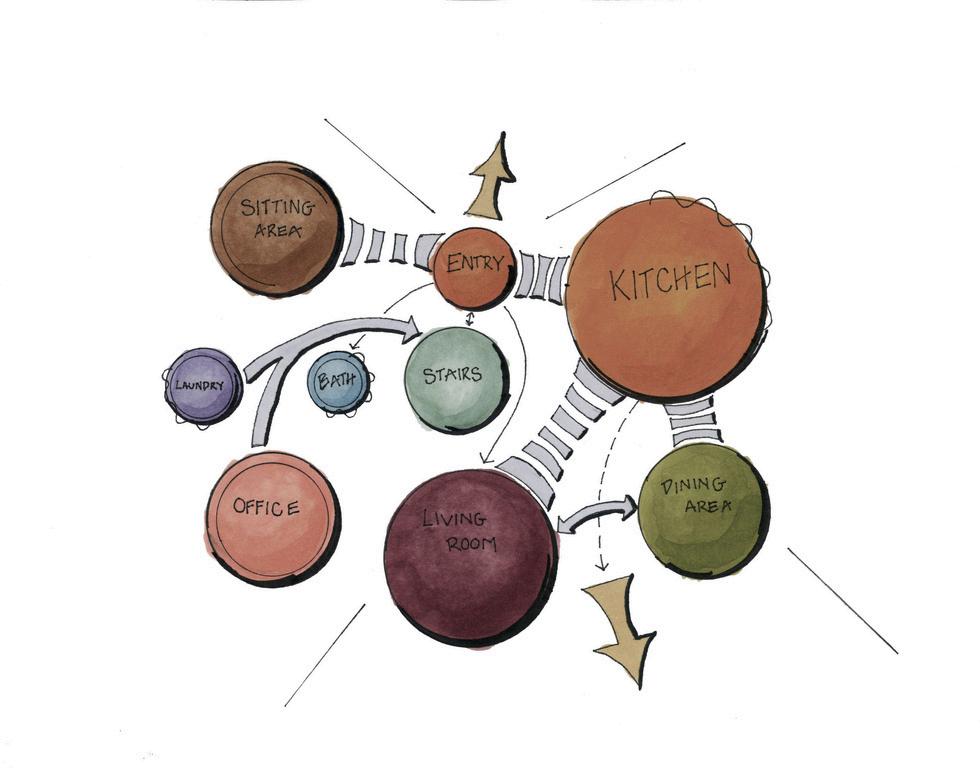 Whendesigningthisspace,the flowthroughthehouse dictatedshapes,sizes, and placements of the elements of the home both aesthetically and functionally. Because of the client’s social nature, an open concept was adoptedforthemajorgatheringpointsofthehouse.Accesstothebackporch fromtheseareaswasalsodesired,sotheseroomsbecamesituatedinthetrue north corner of the house. Angularfeatures were applied to create a modern feel within the home. Drawing inspiration from Frank Lloyd Wright’s methods, thedesignwilldirecttheusersubconsciously;the featuredanglesguidingthe usersofthespaceintotheheartofthehome.