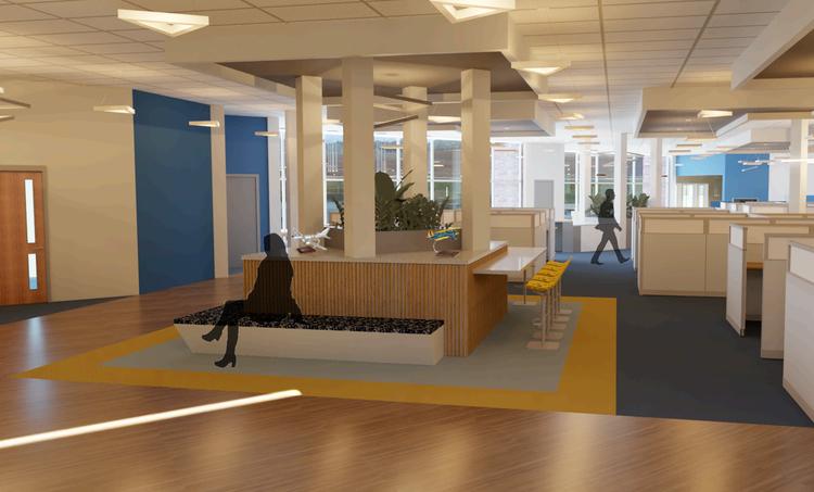 After a site visit to the Academy of Model Aeronautics’ HeadquarterslocatedinMuncie,IndianaandatriptoKimball International, a plan for a workplace remodelwas created in collaboration with two other students. Design decisions were made by considering the feedback from the clients and the identityoftheorganization.