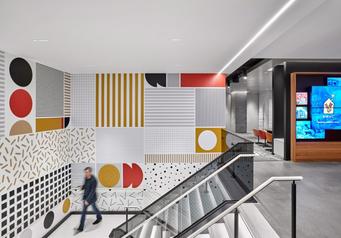 Acustomacoustic cloudsystemwas designedforthe ceilingintheoffice’s kitchenette.Itwas directlyinspiredby the graphicwall picturedaboveinthe company’sglobal headquartersin Chicagodesignedby StudioO+A.