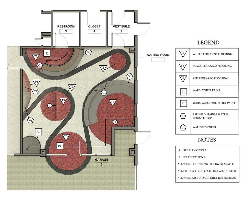 The renovation of this auto repair shop incorporatessleekmaterialsandcontrasting colors to create a high-end feel which compliments the wealthy clientele of the business while alluding to the automotive repair industry with features such as an engine belt inspired flooring pattern, an exploded view sculpture of an engine in the fishtank,andthesilhouetteoftwovehiclesin a head-on collision atop the half wall in the center of the space. Overall, this space creates an atmosphere perfect for Connan’s businessneeds.