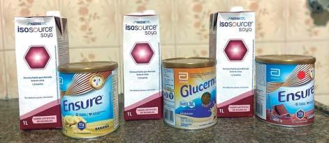 Os suplementos utilizados pelos pacientes são o Trophic e Isosource 1.5 ou 1.2 e o Soya. Eles são específicos para quem apresen-