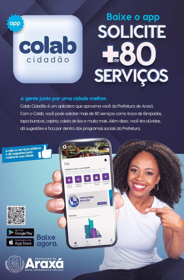 tos pela categoria Ouvidoria SUS que está disponível na plataforma ou pelo contato (34) 9 92571230. Para utilizar o programa basta acessar a loja de aplicativos do celular e baixar o “Colab”, fazer o cadastro com o número do seu CPF e e-mail e selecionar o município de Araxá. Pronto, o cidadão passa a ter acesso a todos os serviços digitais e ferramentas do aplicativo. Para marcar a consulta, acesse o serviço no aplicativo por meio da categoria “Especialidade Médica” ou pelo banner destaque do projeto.