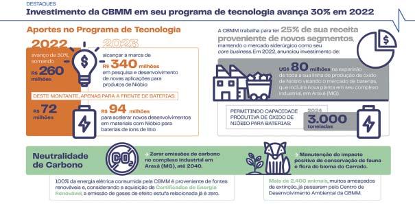 O Programa de Tecnologia da companhia avançou 30% em 2022. A CBMM atua em linha com tendências mundiais de eletrificação, urbanização, digitalização, buscando a sustentabilidade ao desenvolver novas aplicações de Nb para impulsionar inovações nos setores de baterias e armazenamento de energia, nano materiais e eletroeletrônicos. A companhia trabalha para ter 25% de sua receita proveniente de novos segmentos, mantendo o mercado siderúrgico como seu principal negócio (core business). No ano passado, a CBMM anunciou o investimento de US$ 80 milhões na expansão de toda a sua linha de produção de óxido de Nióbio visando ao mercado de baterias com a construção de uma nova planta no complexo industrial em Araxá que deve entrar em operação em 2024.