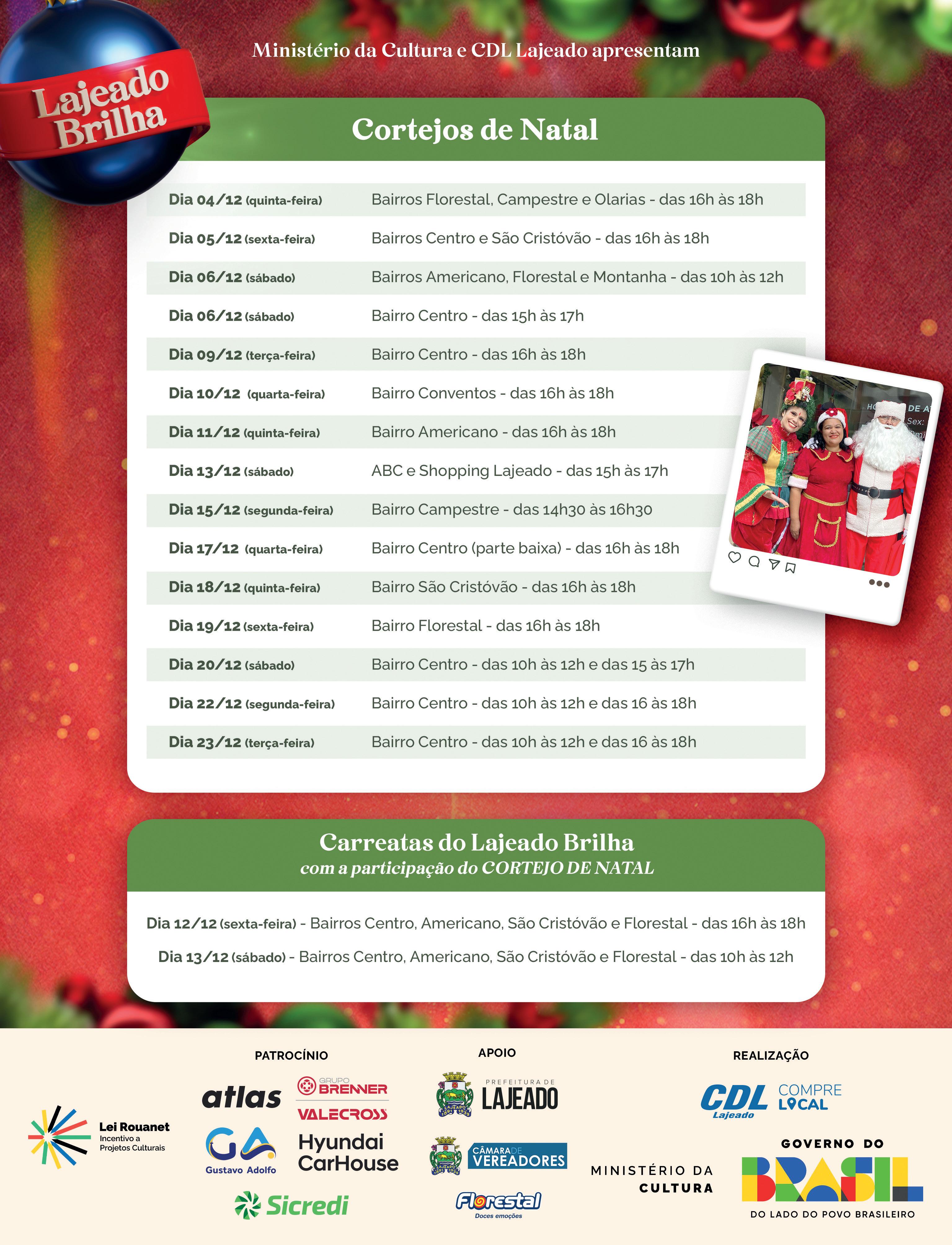 A programação cultural continua no dia 16, com a tradicional Cantata de Natal promovida pela Paróquia São Francisco Xavier, realizada no interior da igreja. No dia 21, o pátio da paróquia recebe apresentações de canções natalinas, reunindo comunidade e visitantes para mais um momento de celebração coletiva.