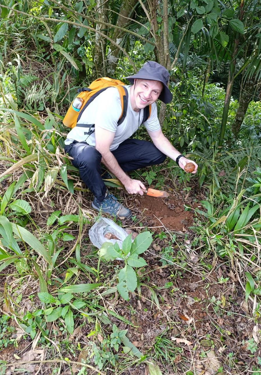 Nosso peregrino das sextas-feiras não vive só de caminhadas. Ele também aproveita o período em meio à natureza para auxiliar no reflorestamento do Vale. Na imagem, plantio de abacates em Linha Rui Barbosa, no interior de Canudos do Vale.