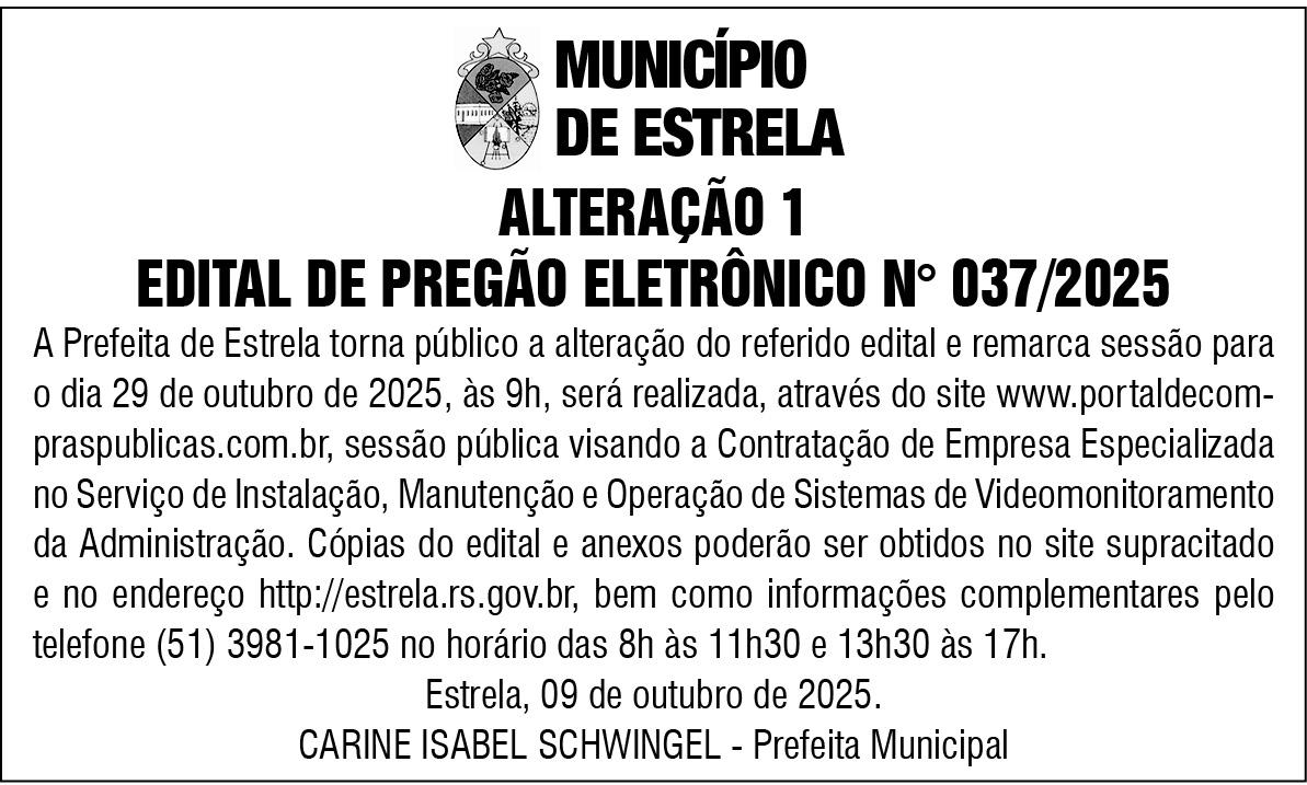 • O governo de Estrela realiza no dia 2 de dezembro a sessão pública do edital de contratação da empresa responsável pela reconstrução da “Trilha do Fritz”. O projeto será diferente do anterior, cuja estrutura foi destruída pela enchente. E é uma verba específica a Defesa Civil Nacional e não pode ser aplicada em outro projeto. Ou seja, ou gasta na trilha, ou devolve ao governo federal.