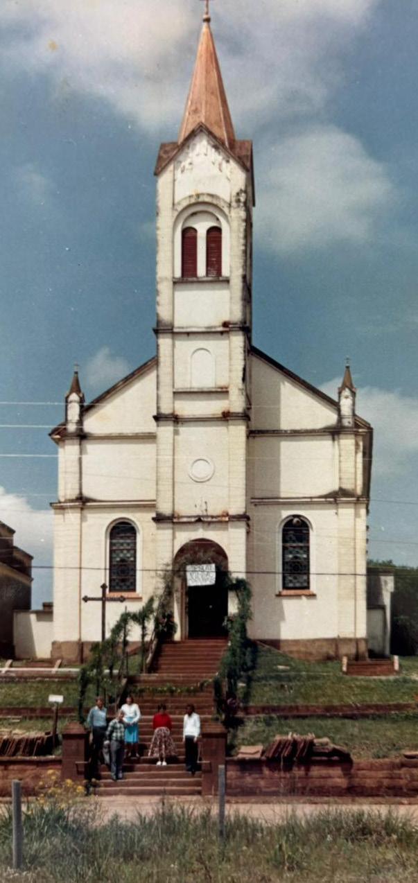 entre os bairros São Bento e Conventos, perto da atual rua João Reinaldo Saffran, que conecta os dois bairros. “A estrada era um trilho de chão batido que eu atravessava todos os dias para ir na escola”, conta Marta. Ela estudou na escola paroquial, ao lado da igreja católica do São Bento. “Fiz minha primeira comunhão aqui também, aos nove anos. Lembro que a gente precisava ajudar a limpar a escola e a igreja”, recorda. O pai dela ajudou na construção do templo em 1948, levava pedras com a junta de bois. Nos anos 1990, Marta casou e se mudou para o terreno onde mora ainda hoje, bem próximo ao antigo salão da Sociedade Esportiva São Bento, às margens da rua Carlos Spohr Filho. “Meu
