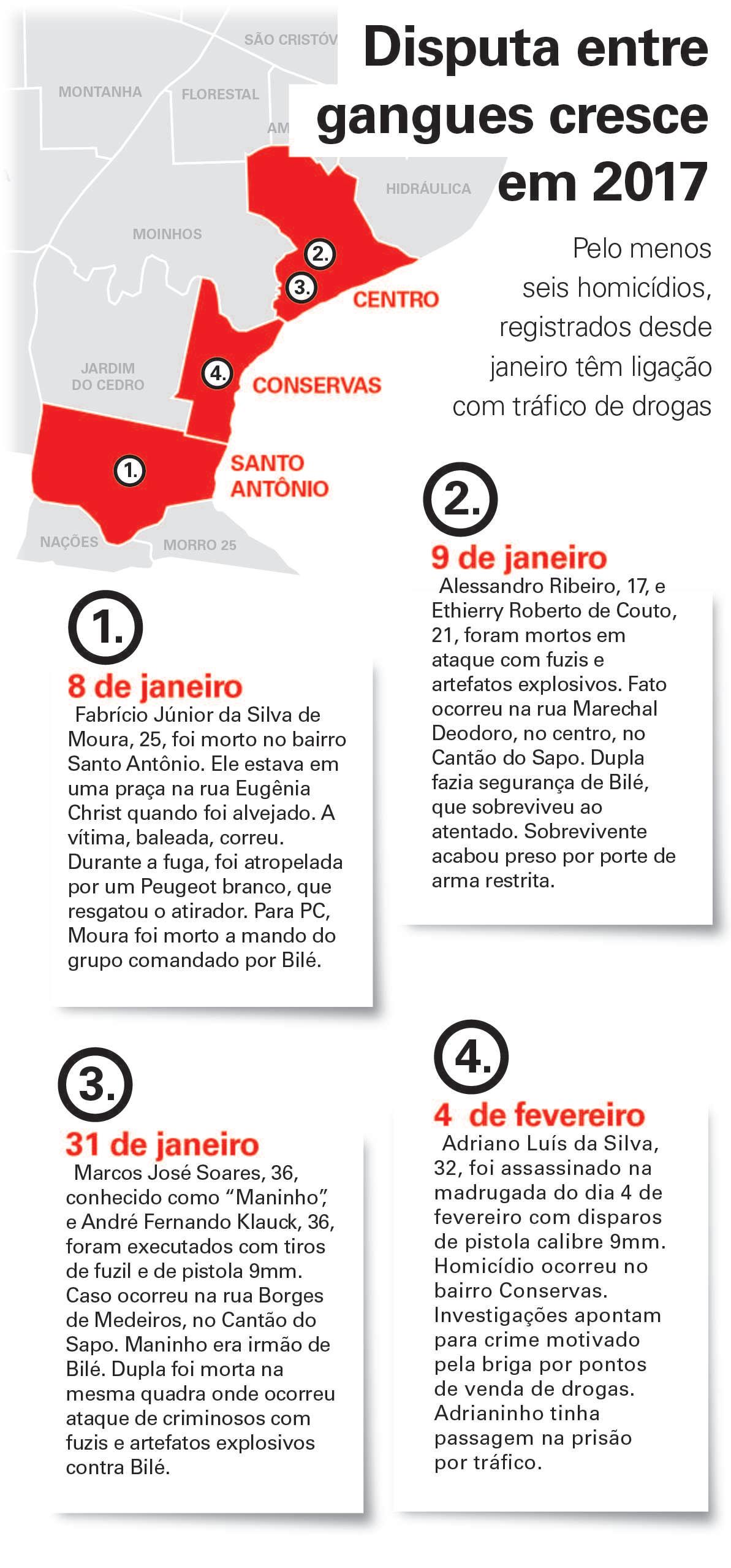 Otávio Batista Moesch, 21, é a sétima vítima de homicídio do ano. Ele foi morto na própria casa, na rua Igrejinha, no bairro Santo Antônio, com golpes de facas e tiros. O crime ocorreu por volta das 21h. O corpo foi encontrado no lado de fora da residência.