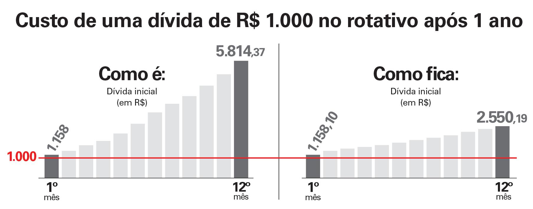 Pela regra antiga, quem deixava de pagar uma fatura de R$ 1 mil teria em 12 meses uma dívida de quase R$ 5,8 mil, devido ao mecanismo de juros compostos. Dessa forma, se um consumidor não pagava uma fatura, o atraso resultava em juros simples no primeiro mês.