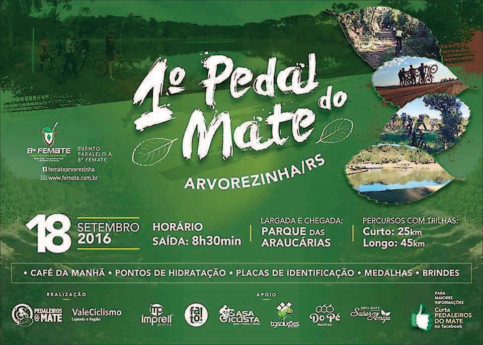 ValeCiclismo Lajeado e Região e Pedaleiros do Mate convidam para a primeira edição do Pedal do Mate. A atividade ocorre no dia 18, a partir das 8h30min, em Arvorezinha. Participantes podem percorrer trajetos de 25 ou 45 quilômetros.
