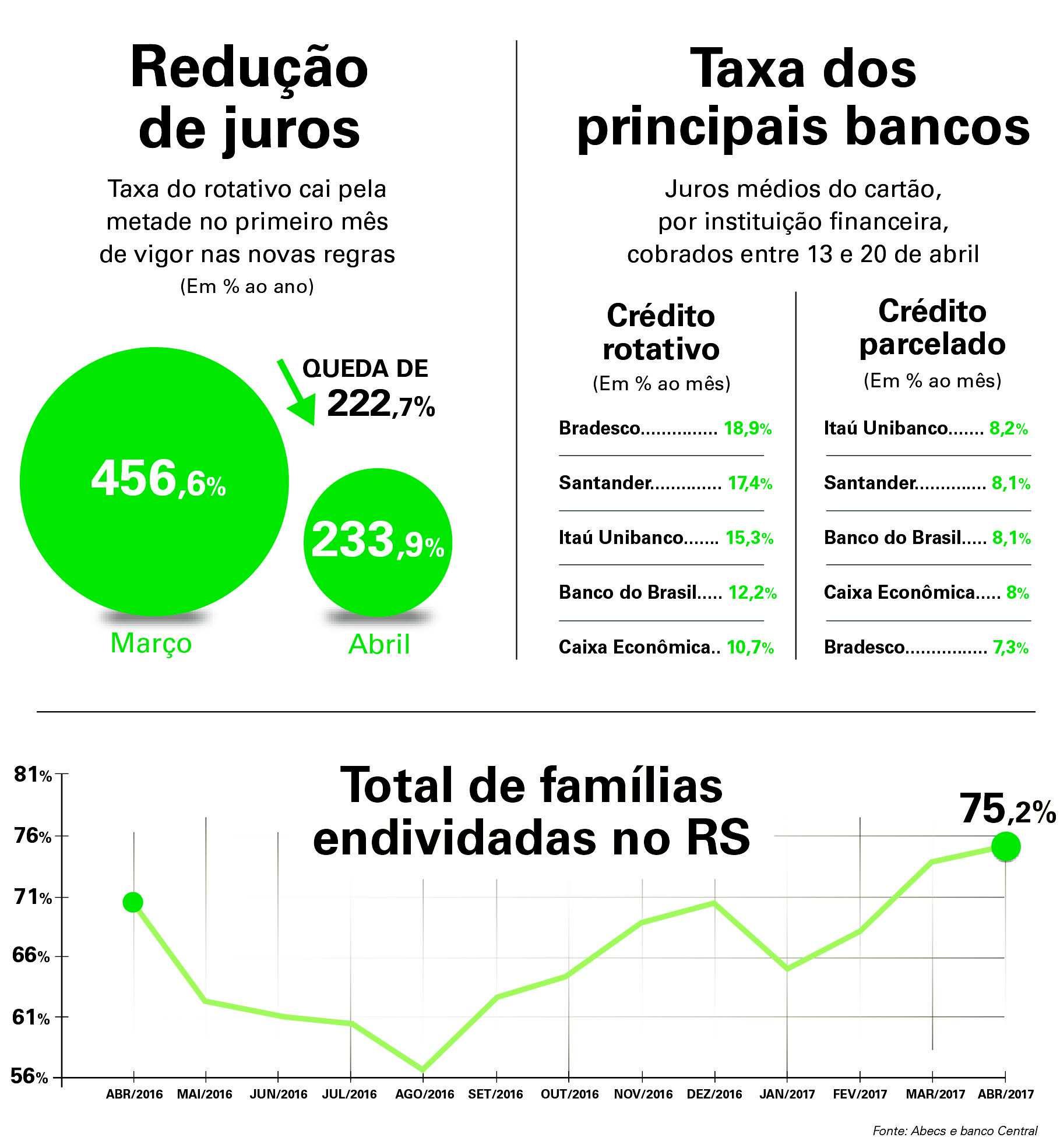 Mudanças nas regras do rotativo provocam redução nas taxas de juros cobrados pelas instiuições bancárias. O índice médio anual caiu de 456% em março para 234% em abril. Apesar da mudança, índice de endividamento subiu, alcançando 75% das famílias gaúchas.