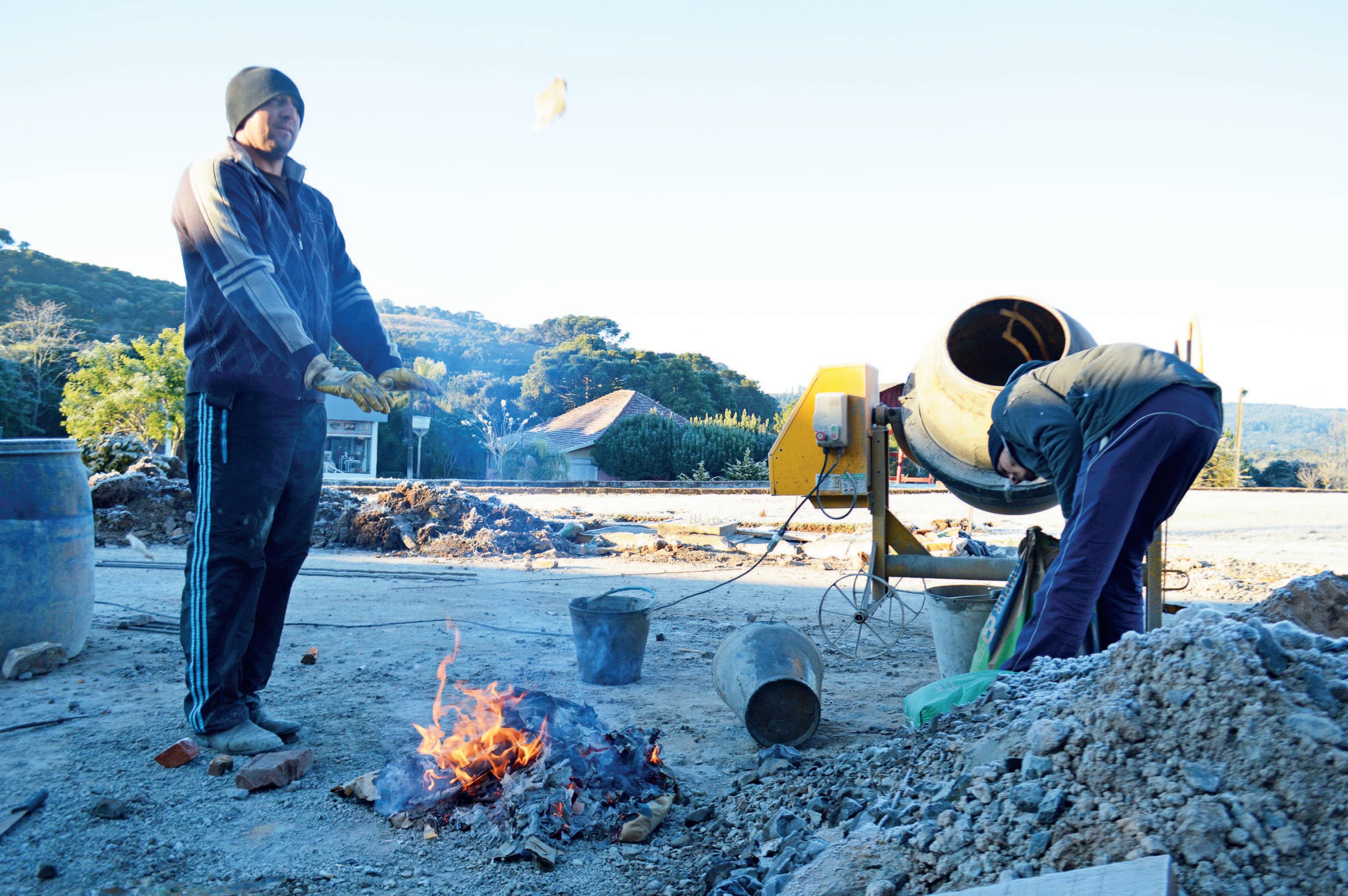 Em Boqueirão do Leão, a sensação térmica de -2ºC na manhã de ontem obrigou trabalhadores da construção a improvisar uma fogueira. Massa de ar polar permanece no estado neste fim de semana