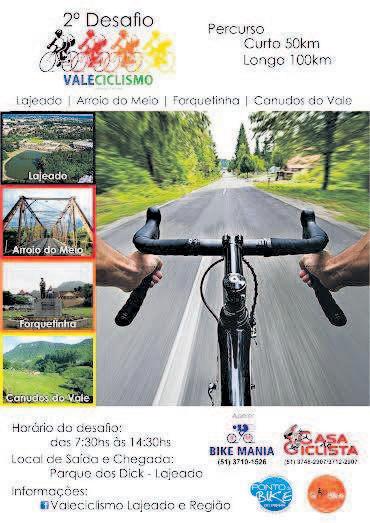 O segundo desafio ValeCiclismo já tem data marcada: 22 de maio. O percurso com trajetos de 50 e cem quilômetros passa por Lajeado, Arroio do Meio, Forquetinha e Canudos do Vale