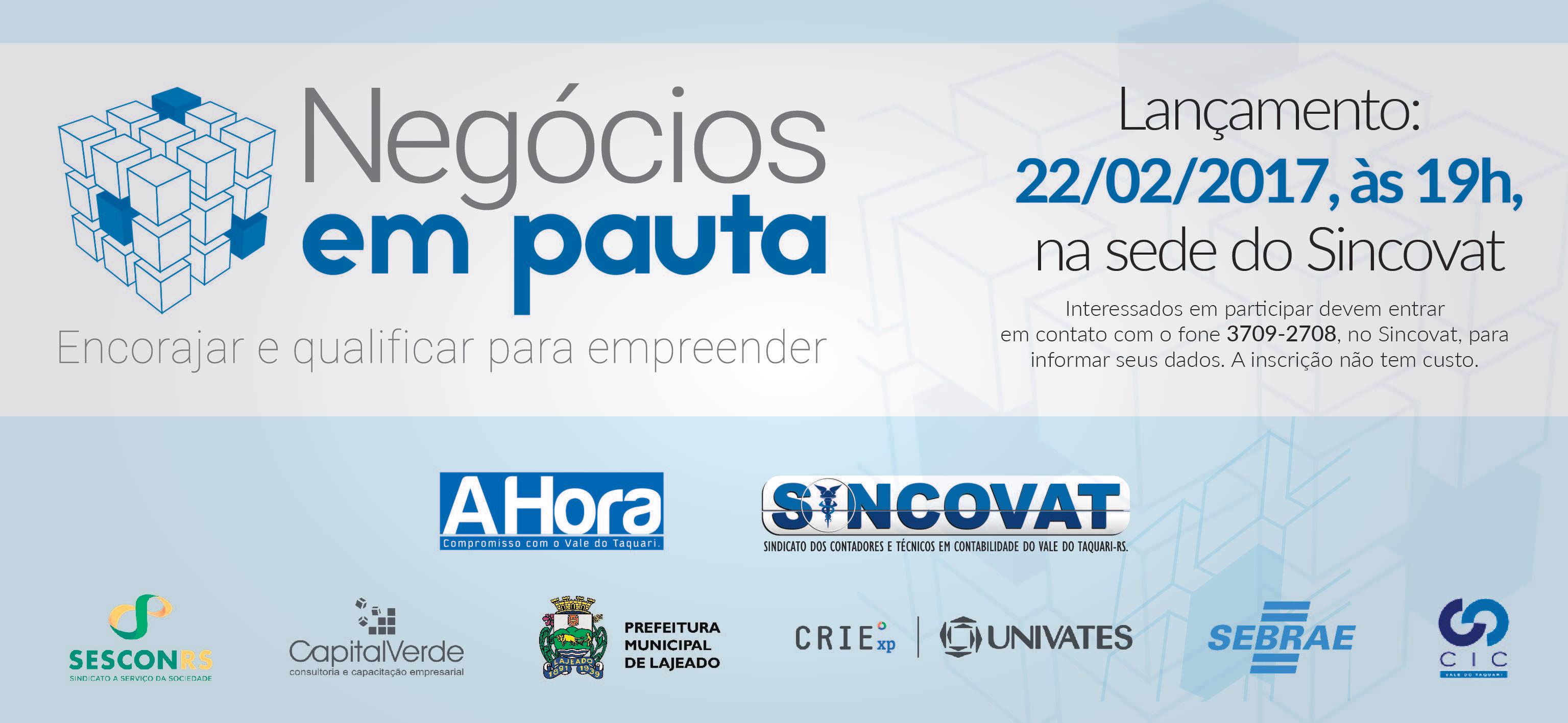 através do e-mail negociosempauta@sincovat.com.br ou no telefone (51) 3709-2798. Logo após o evento, será servido um coquetel de confraternização. O projeto é uma realização do Sincovat e Jornal A Hora e tem o apoio de Sescon-RS, Univates/ Crie, Sebrae, Capital Verde, Câmara da Indústria, Comércio e Serviços (CIC) Vale do Taquari e Governo de Lajeado.