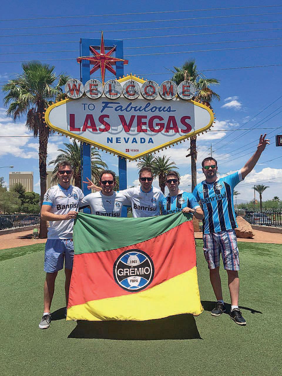 Os teutonienses Jonas Wolf, Anderson Käfer, Augusto Redecker, Mathias Horn e Gustavo Rosolen passam as férias de inverno em Las Vegas, nos Estados Unidos. A gurizada que vai ficar uma semana por lá não esqueceu do futebol e levou camisetas do Grêmio. Por e-mail, eles brincaram que vão abrir um novo consulado em solo