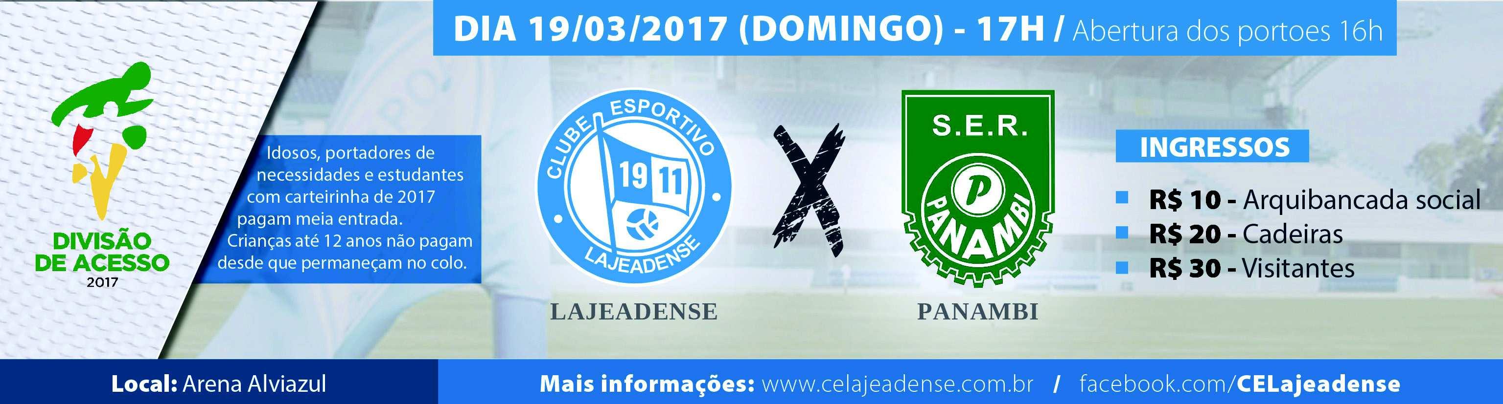 Com o objetivo de retornar à zona de classificação na próxima fase, o Lajeadense recebe neste domingo o Ser Panambi, de Panambi. A partida inicia às 17h, na Arena Alviazul. Ingressos são vendido somente na hora ao preço de R$ 10 (arquibancada), R$ 20 (cadeira), R$ 30 (visitante). Estudantes, com carteirinha, pagam meia-entrada. Sócios em dia não pagam.
