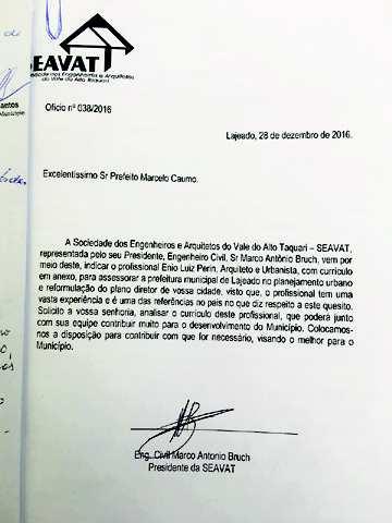 O prefeito de Lajeado, Marcelo Caumo, envia correspondência à coluna para informar que a decisão de contratar o urbanista, Ênio Perin, não foi unilateral do Executivo. Ele envia uma nota com respectivas assinaturas de quase 30 engenheiros e arquitetos, entre