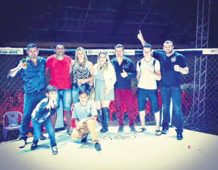 Dois atletas do Centro de Treinamento Mão de Pedra, de Teutônia, se sagraram campeões em competição de artes marciais em Santo Ângelo. São eles Sebastião Ferreira e Ismael Loesch. Na foto, os lutadores com familiares, amigos e Dirlei Mão de Pedra.
