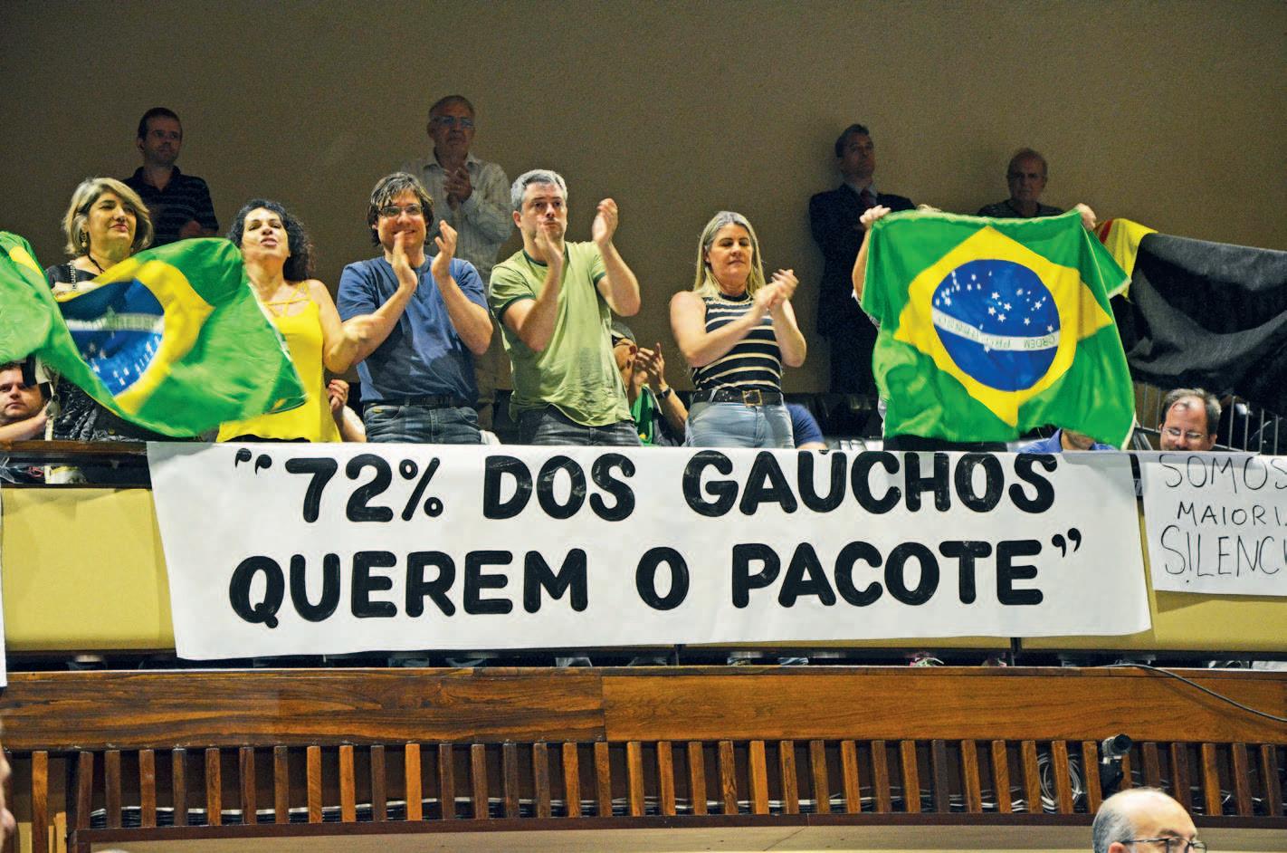 Durante toda a tarde e a noite de ontem, o plenário Júlio de Castilhos se dividiu entre prós e contra o pacote anunciado pelo governo de José Ivo Sartori, anunciado como uma proposta anti-crise, mas visto por muitos como a destruição do Estado. A cada manifestação dos parlamentares, vaias e aplausos, gritos, ofensas e retrucos. Faixas expressavam ideias.