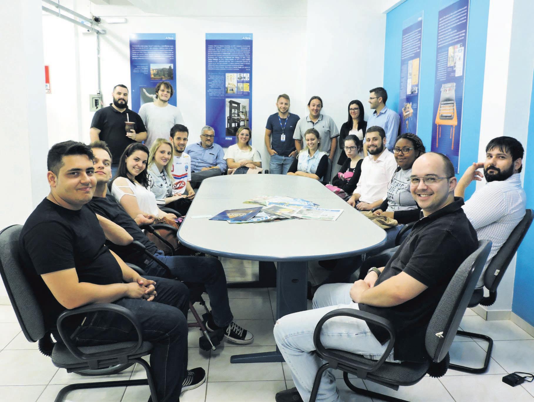 Estudantes da disciplina de Teorias do Jornalismo da Univates visitaram, na noite de ontem, a redação do A Hora. Trazidos pelo professor Leonel José de Oliveira, os acadêmicos tiveram como objetivo aliar a teoria das aulas à prática da produção jornalística. Eles foram recepcionados pelos diretores geral Adair Weiss e de conteúdo Fernando Weiss, repórter Thiago Maurique e editor Filipe Faleiro. Visitaram as instalações e conheceram os processos adotados pelo diário. Acompanharam a revisão, edição e diagramação do jornal durante o fechamento, quando são definidos os detalhes do conteúdo que chegará ao leitor no dia seguinte.