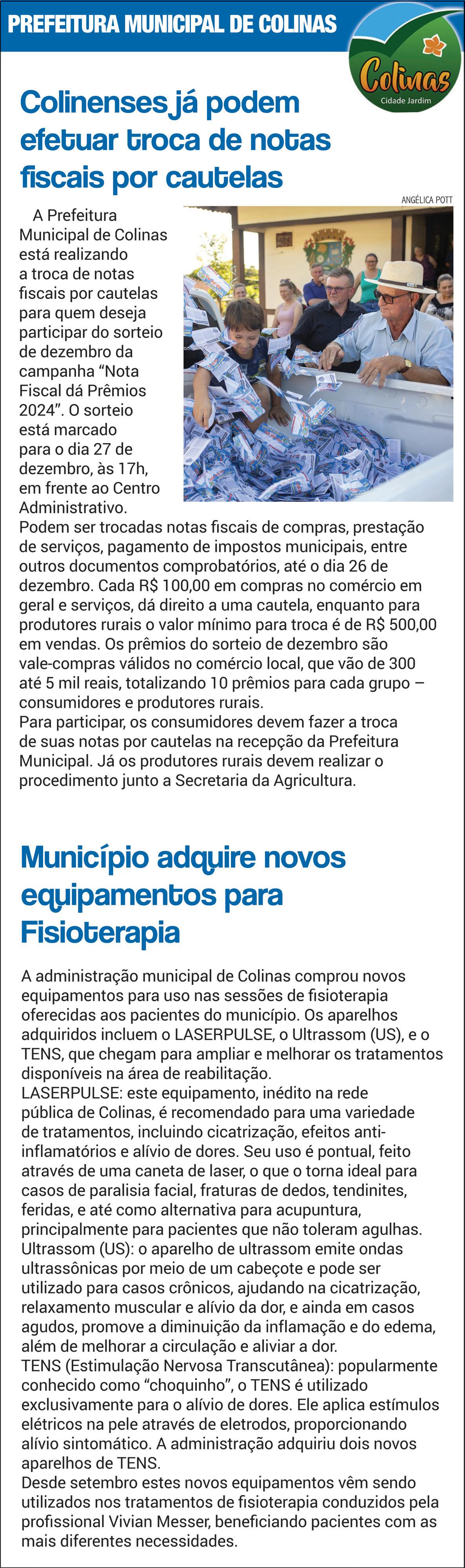 voltar a conversar com o Fórum das Entidades antes de qualquer decisão. “O aditivo não foi assinado. Espero encerrar o mandato com isso resolvido. Mas também não vamos nos apressar. Se tiver que ficar para 2025, não há problema”, resume Caumo. Além do prefeito e do vice-presidente da Acil, também participaram da reunião a vice e prefeita eleita, Gláucia Schumacher, os presidente da Câmara da Indústria e Comércio da região (CIC-VT), Angelo Fontana, da CDL Lajeado, Giselda Hamm, do Sindilojas, Giraldo Sandri, da Associação Pró-Segurança (Alsepro), Dieres Kaefer Martins, da Acil, Joni Zagonel, do vice-presidente do Conselho de Desenvolvimento (Codevat), Rogério Wink, vice-presidente de Relações Institucionais da Acil, Eduardo Gravina e do gerente da Acil, Antonio Juarez da Silva.