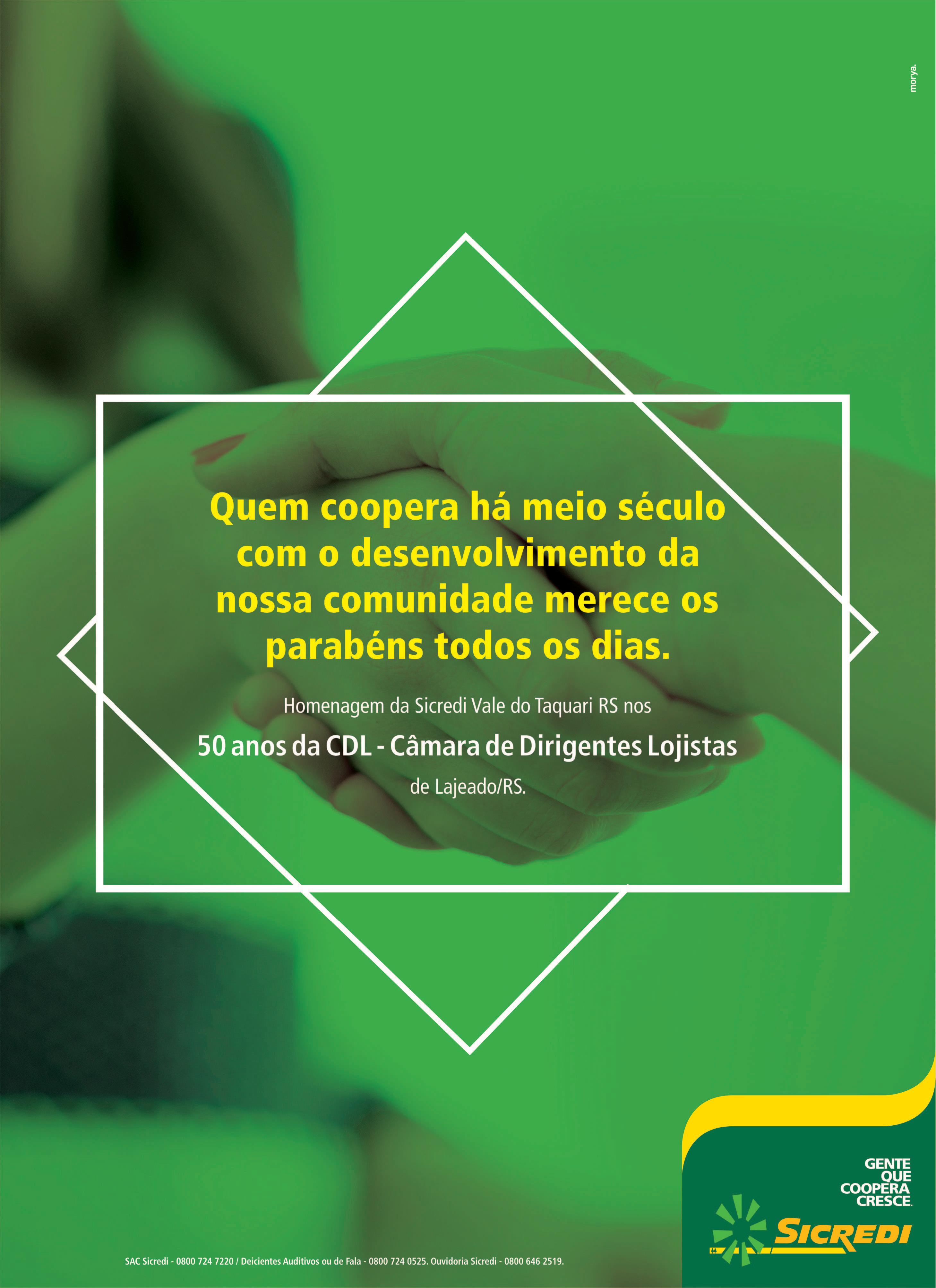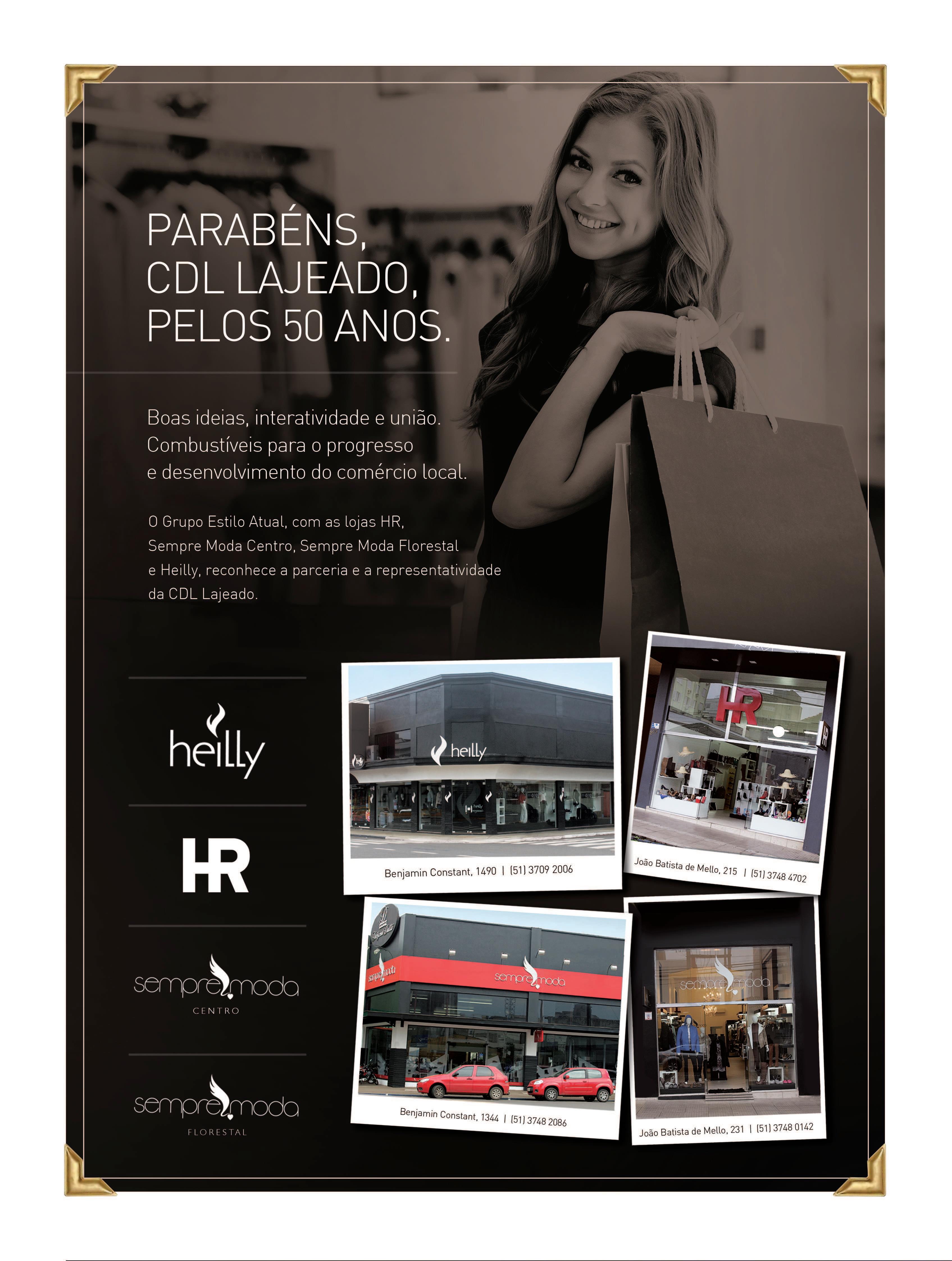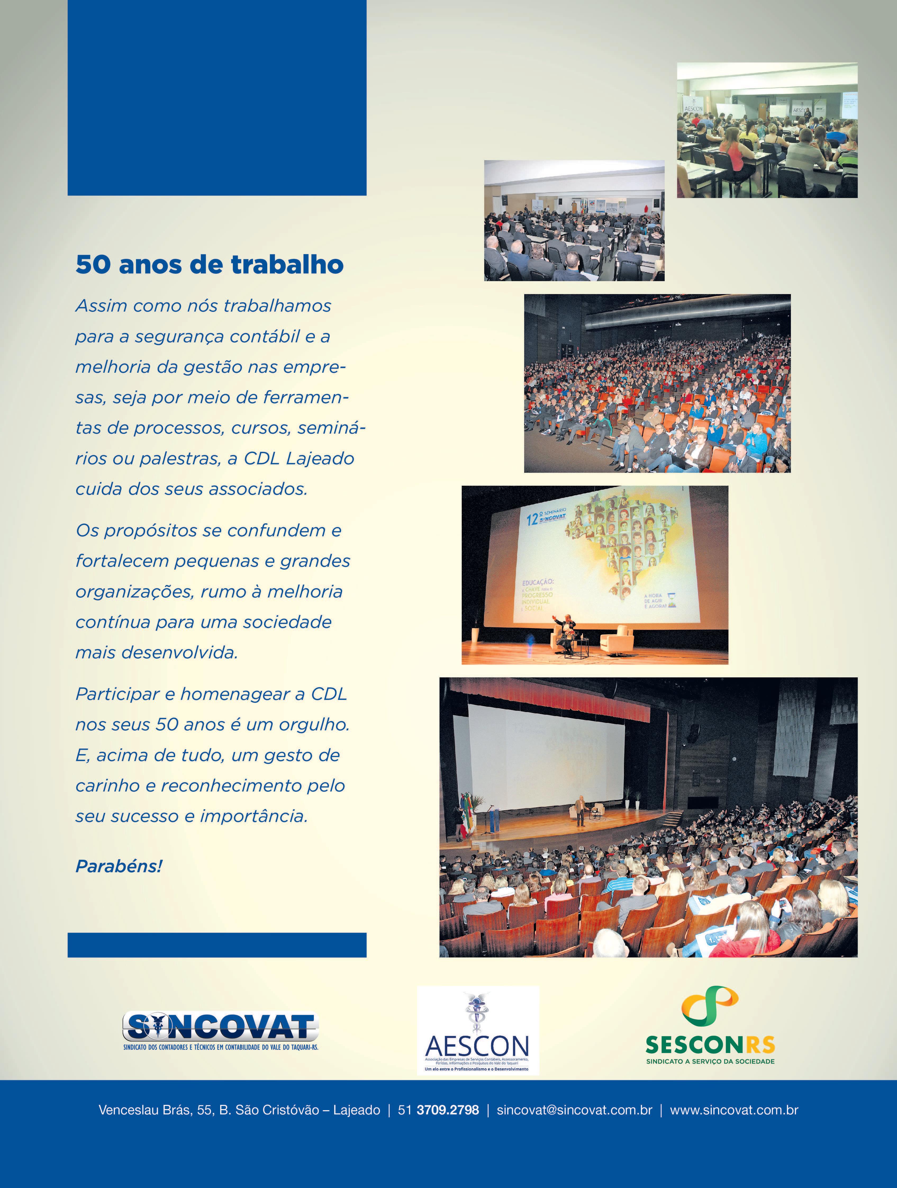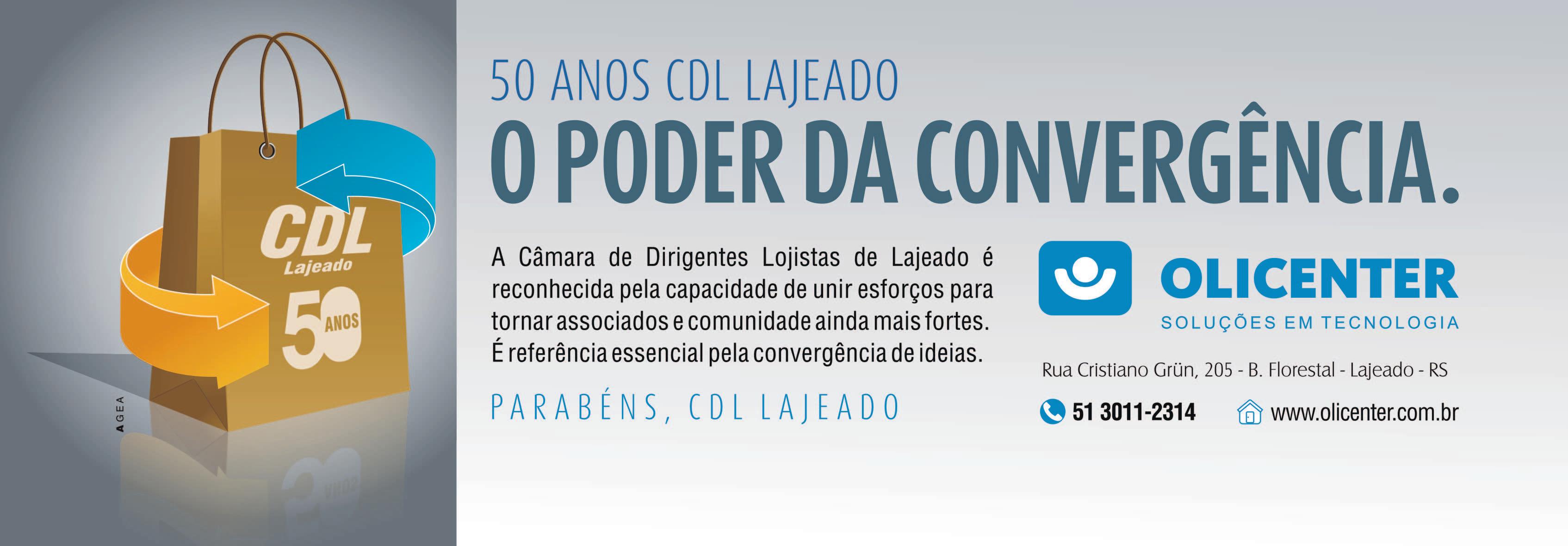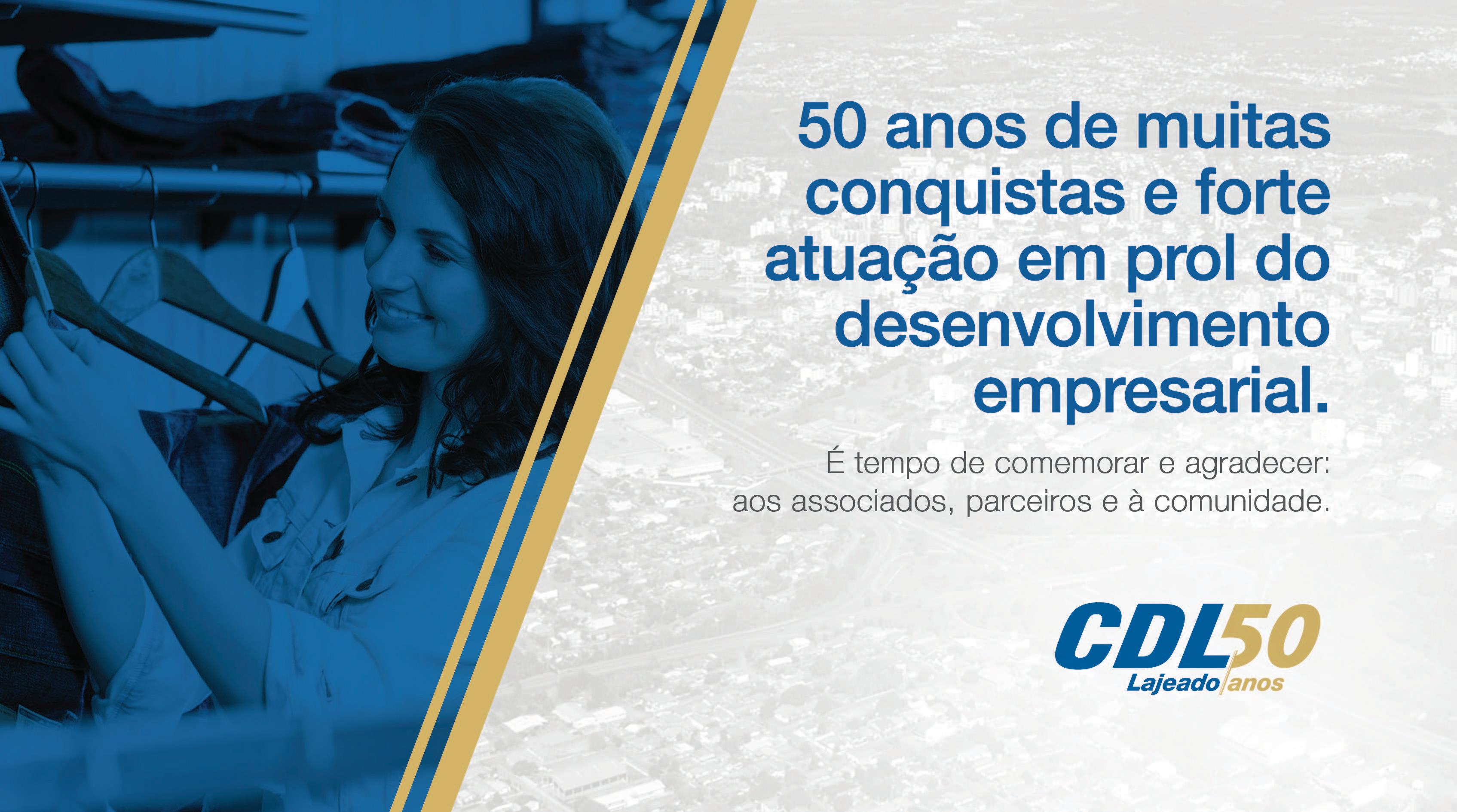 Nos cumpre o dever de render homenagens a essa importante organização do município de Lajeado: parabéns à CDL pelos seus 50 anos. Com certeza, o protagonismo de nossa cidade como centro de compras do Vale do Taquari se deve ao trabalho incansável de todos os líderes que estão, ou estiveram, à frente dessa instituição que envida contínuos esforços para dinamizar o varejo de nosso município com iniciativas como o Lajeado Brilha e a Convenção Lojista. Parabéns a todos os integrantes da grande família CDL Lajeado, de ontem e de hoje, que sejam os primeiros 50 anos de muitos que virão.