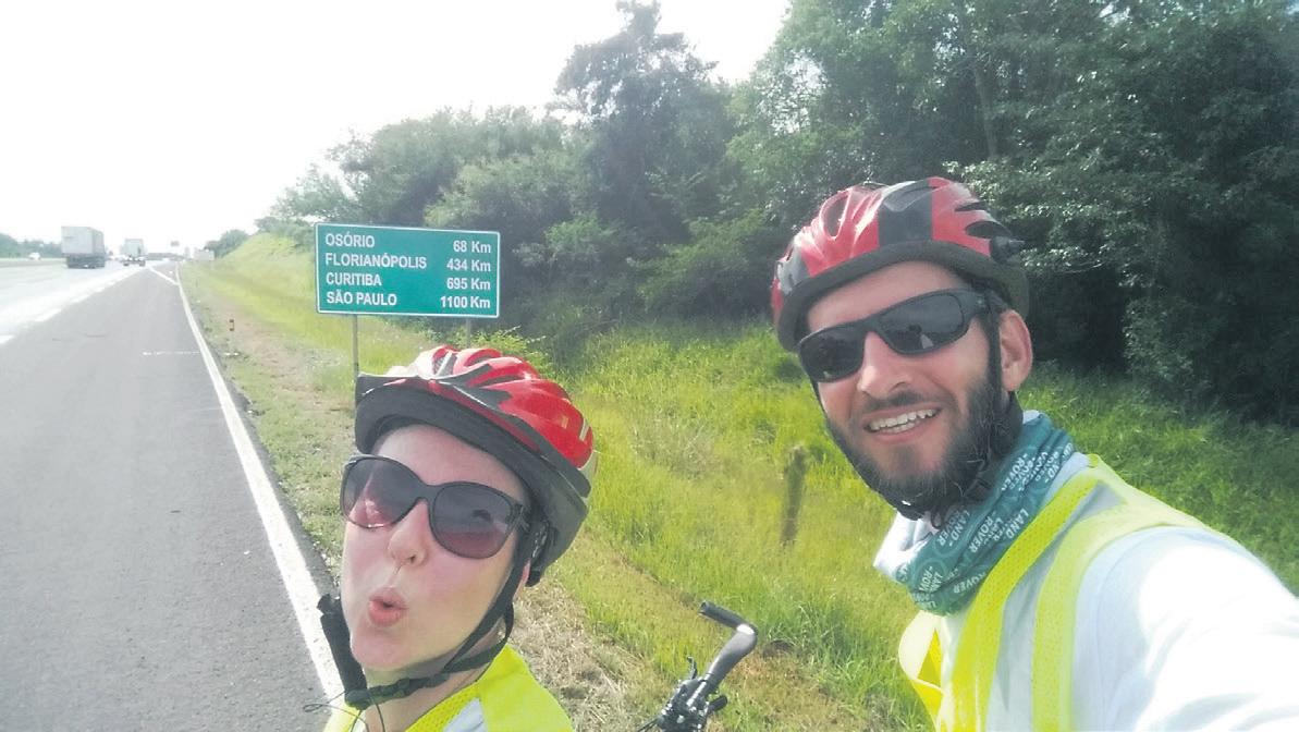 estrada sem sofrer violência foi uma peleja. Ao percorrer dois dias de viagem pela BR-386, o casal entendeu o problema da mobilidade.”Um policial rodoviário nos orientou para que evitássemos pedalar na estrada e que aconselhassem os amigos ciclistas para que façam o mesmo. De fato é perigoso”, explica Carolina. Ela nunca havia percebido que no trecho não havia acostamento. “Por mais que a gente preze e queira a liberdade, ao viajar de bicicleta, seguimos presos ao fluxo dos carros e caminhões.” Para a lajeadense, as pessoas deveriam ter o direito de ir e vir, sem que representasse um risco mortal. “ Ficamos reféns do que o maior e mais forte quer”, lembra.