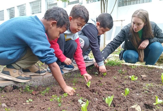 A escola mantém horta para produção de alimentos e composteira, aproveitando restos de alimentos e ensinando os alunos sobre o ciclo natural de produção e consumo. Eles participam de todas as etapas: plantam, cuidam, colhem e consomem os alimentos na merenda escolar, vivenciando a sustentabilidade na prática.