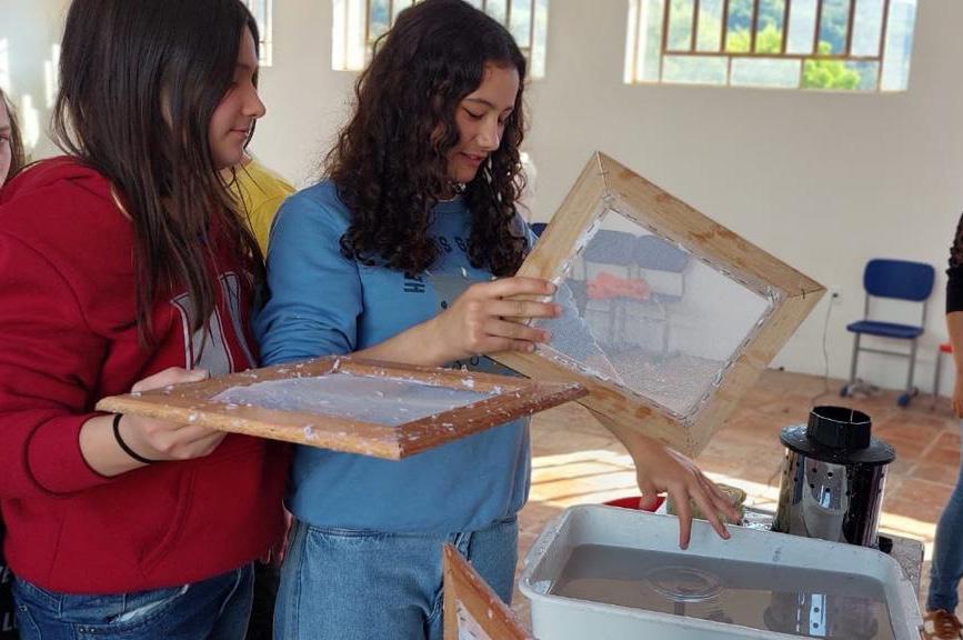 Os alunos transformam papéis usados em novas folhas, que se tornam cadernos ecológicos (cadernos de época). Esses cadernos são utilizados nas atividades do turno inverso, conduzidas pelos professores da Rede Calábria.