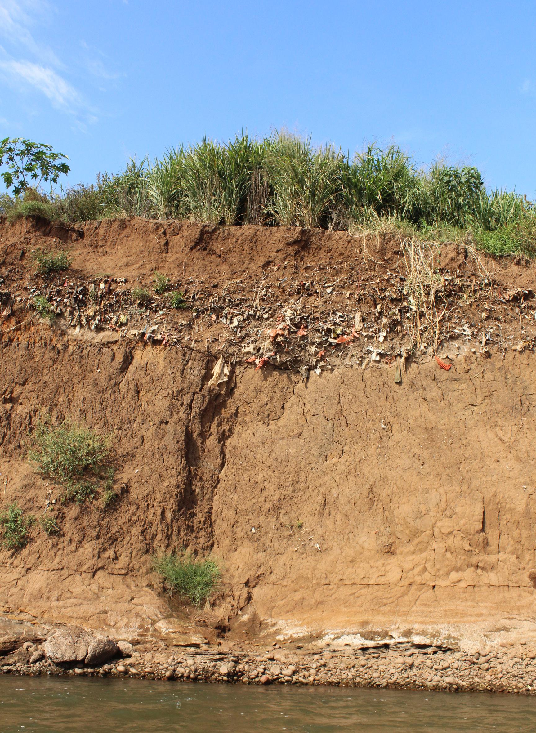 Enchente de 2024 levou mata ciliar e parte da barranca do rio Taquari, expondo um antigo lixão
