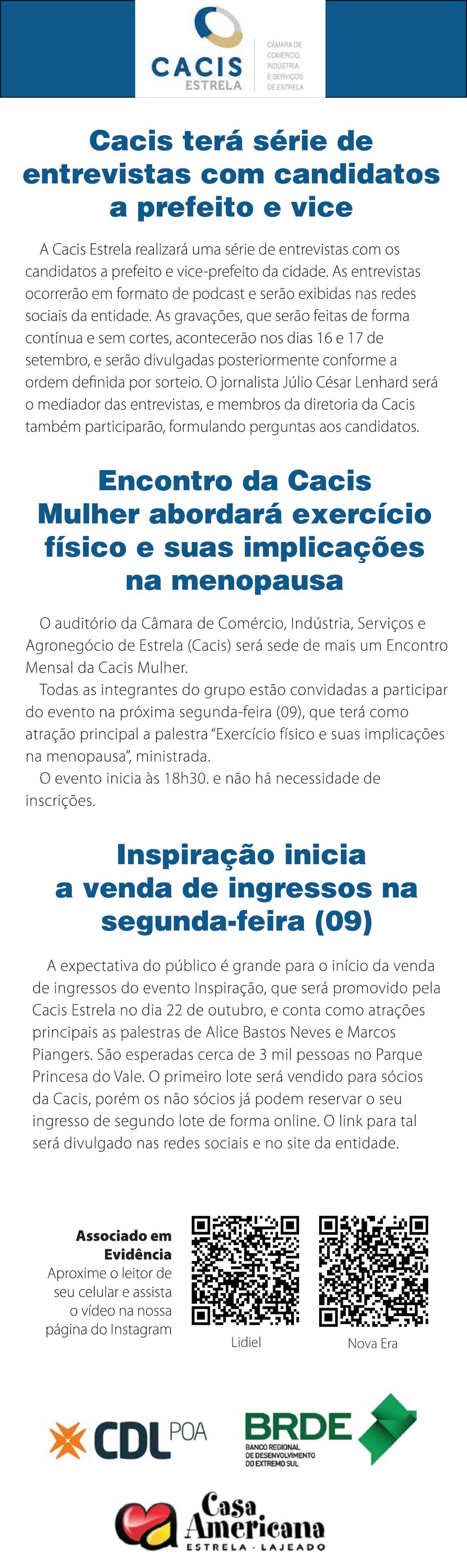A Câmara de Comércio, Indústria, Serviços e Agronegócio (Cacis) de Estrela organiza uma série de entrevistas com os candidatos a prefeito e vice-prefeito ao Executivo estrelense. Representantes dos