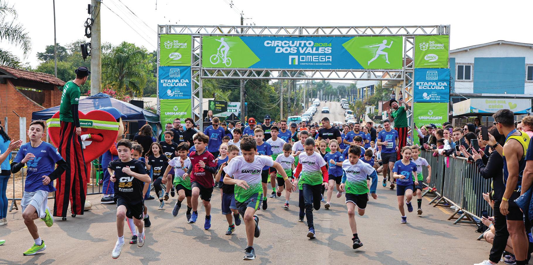 Pouco antes da largada da prova kids do Circuito dos Vales, Sofia e Enzo se preparavam. Os atletas seguem os passos da família de corredores. Sofia é filha do multicampeão Igor Bohn. Já Enzo é neto do ultramaratonista Gilberto Ferreira.