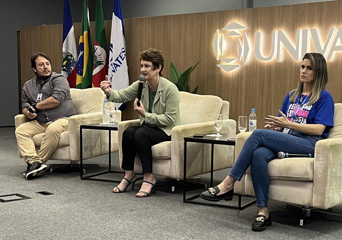 com a palestra da psicóloga, mestre em ensino, orientadora educacional do Ceat e professora da Univates, Denise Polonio. Ela abordou a importância de criar espaços de acolhimento para crianças e adolescentes afetados pelas enchentes. “Estamos em um momento em que a vida parece seguir em frente, mas muitos ainda carregam a tristeza e a irritabilidade. Precisamos estar atentos a esses sinais”, alerta.
