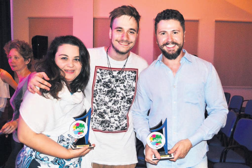 O trio Tatiana Linhares, Diego Abelleira e Éderson Winck, da Companhia de Teatro da Univates, foi condecorado no Projeto Portal Cultura pelo espetáculo Vale dos Infortúnios (foto 1, da esq. para a dir.). Leandro Ferreira, subgerente do Sesc, e Betina