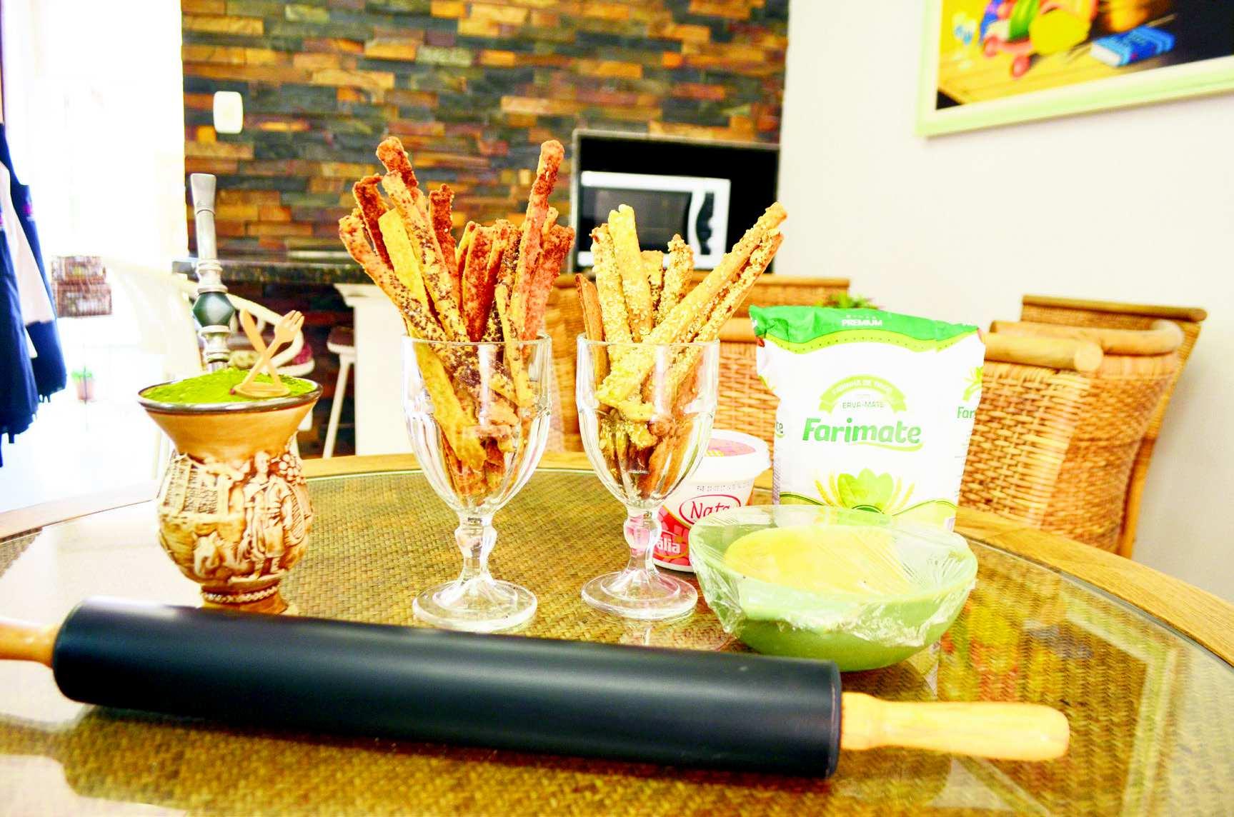 deve ser pincelada com gema de ovo, que funciona como uma espécie de cola para começar o acabamentos dos palitinhos. Coloque por cima gergelim, parmesão, chia, orégano, o que preferir.