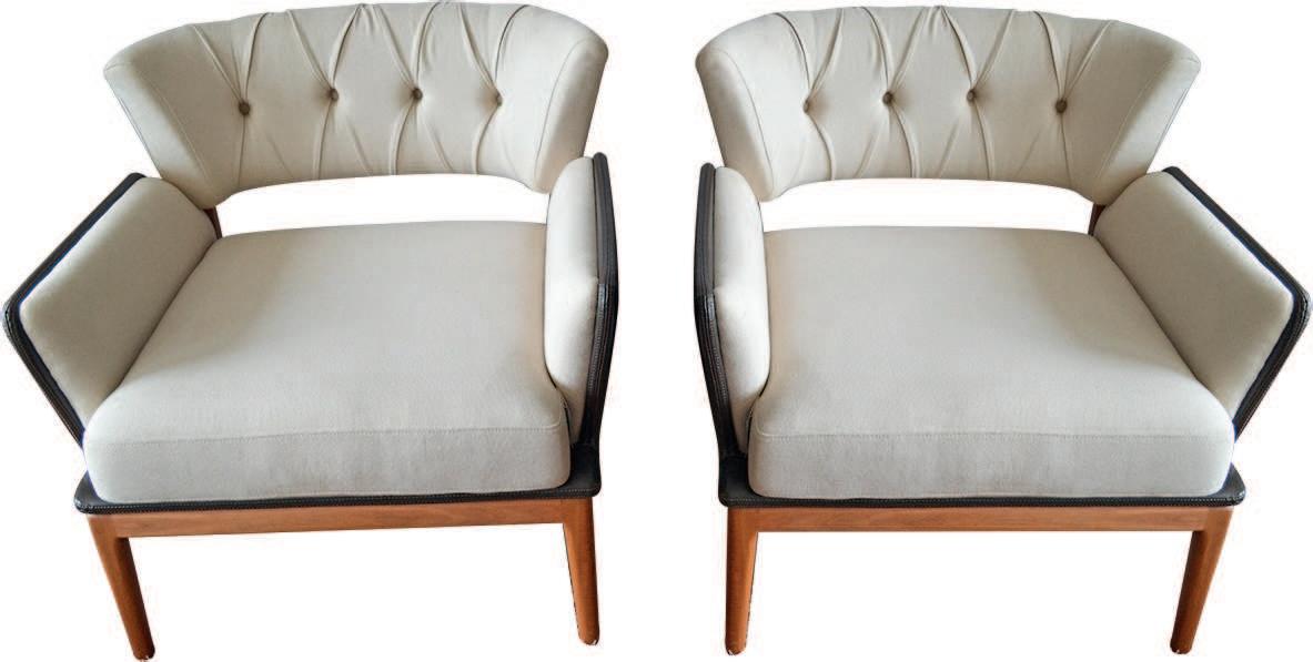 4| Poltrona com acabamento em linho e revestimento de detalhes em couro, da Colletanea Móveis e Decoração