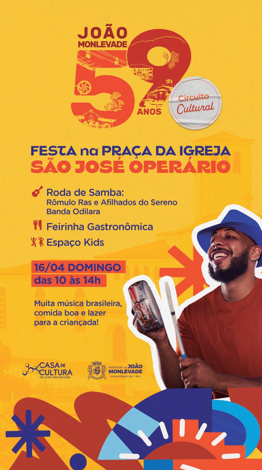 Entre as comemorações do aniversário de 59 anos de João Monlevade, a Prefeitura, através da Fundação Casa de Cultura, promove uma festa na praça da Igreja São José Operário, Centro Industrial, no dia 16 de abril.