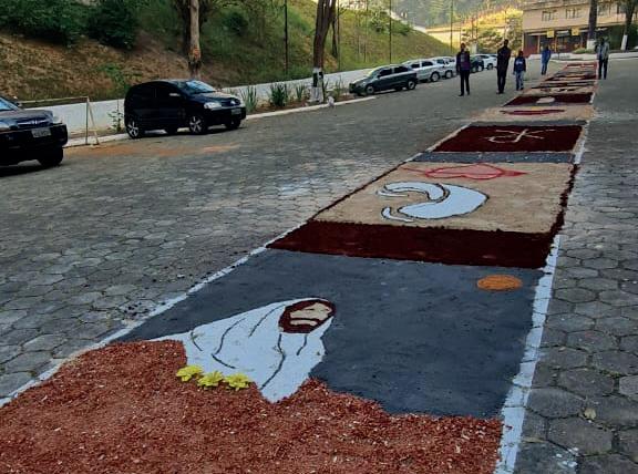 tapetes coloridos de serragem e areia, como estes no exterior da matriz São José Operário, que começaram a ser confeccionados ainda durante a noite anterior.