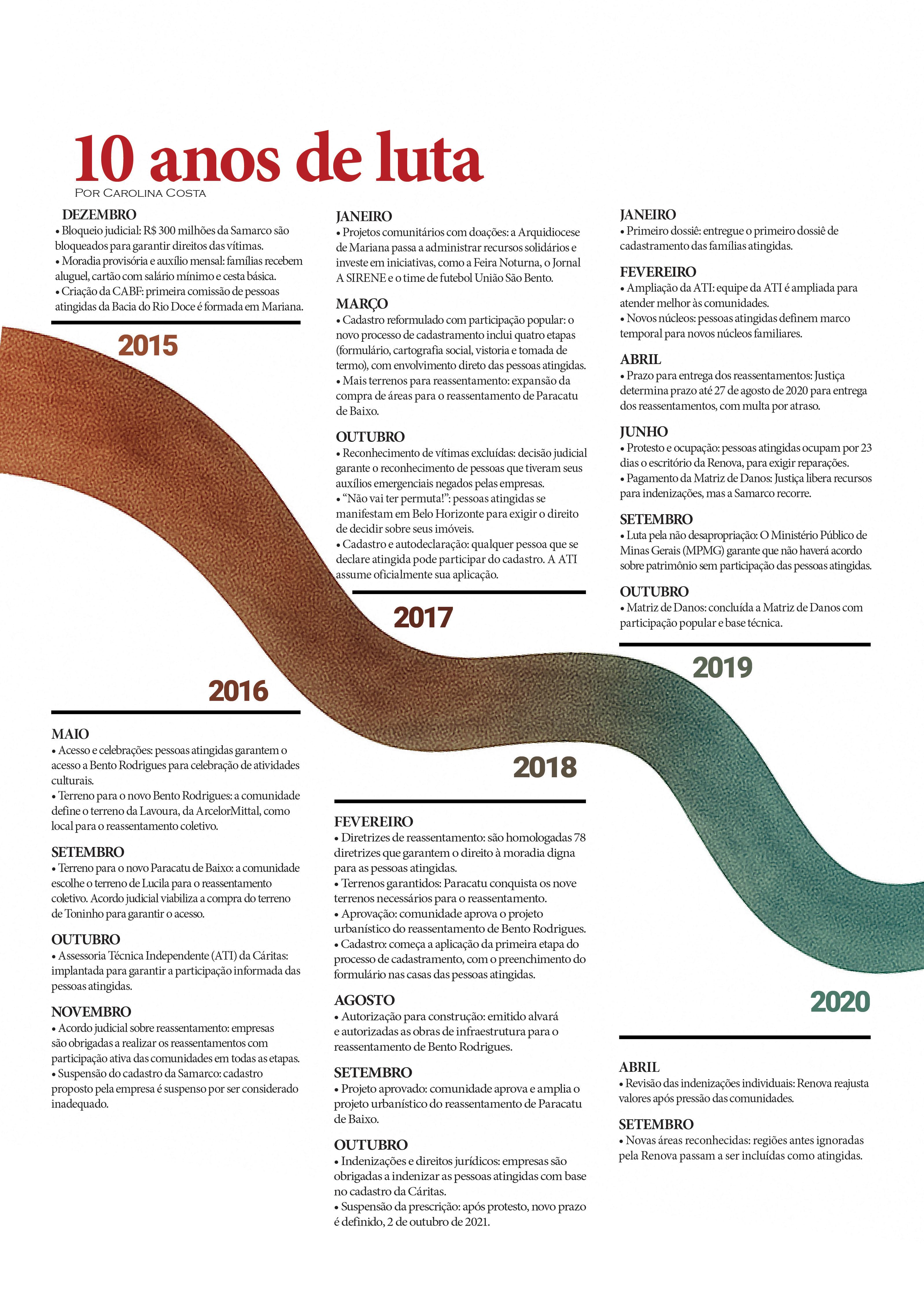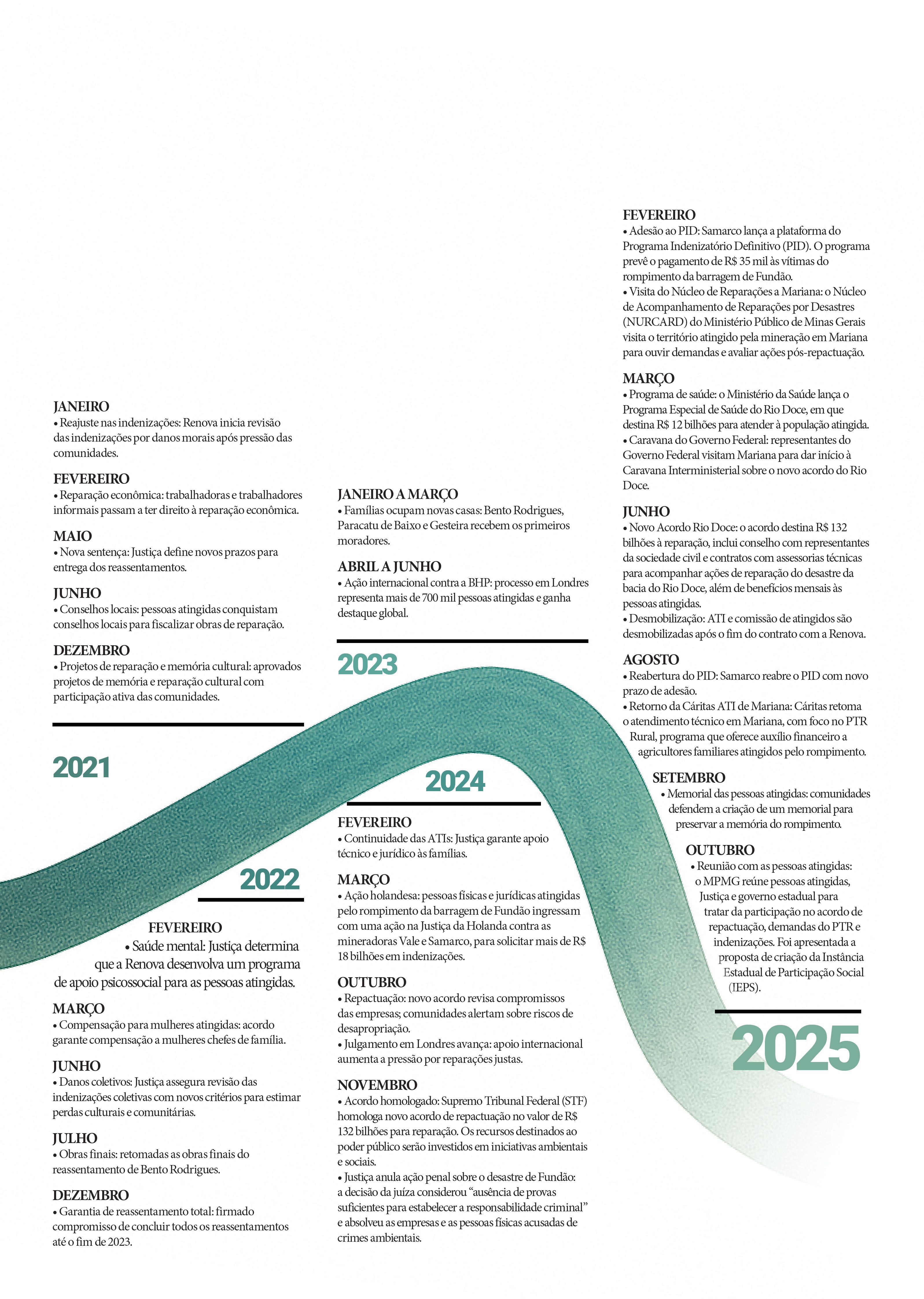 No entanto, não é apenas no submundo dos esquemas ilegais que operam as empresas que perpetuam o modelo predatório. À luz do dia, valores de compensação são usados como permuta para revitimizar pessoas e comunidades que, há 10 anos, lidam com os danos do rompimento da barragem de Fundão. O “Projeto Longo Prazo”, da mineradora Samarco, aprovado por órgãos, como o Conselho Estadual