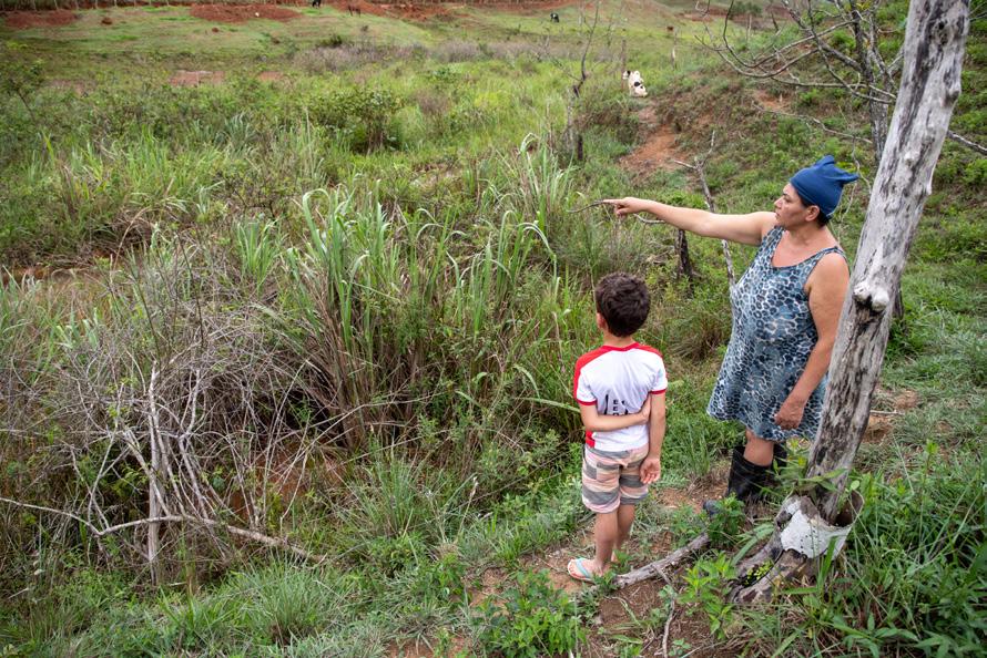 A gente tá tendo problema na estrada, além do problema com a contaminação de lençol freático e de nascentes. Hoje a situação aqui tá pior do que quando rompeu, porque olha o tamanho do monte que eles colocaram ali na porta de casa. Aqui mora criança, o Zé leva o menino para es cola no ombro com a maior dificuldade, passan do em cima daquele trem ali. Minha filha está com um problema sério de saúde, com ansieda de, descobriu há pouco tempo. Depois que co meçaram essa obra, ela falou que a gente não tem sossego, que tá pior que um cachorro sem dono. Lá em Paracatu de Cima, a gente foi atingido e aqui também. Lá a gente perdeu renda e a ter ra ficou contaminada. Quando chove aqui, esse material escorre para baixo, vai pro córrego, pa rece até que tem uma nascente ali em cima. Eu ainda uso essa água na horta e com os animais… Aqui é só chover que atola tudo. Para entrar ou sair da minha casa, eu tenho que enfrentar essa lama. O primeiro dia que choveu muito, meu marido saiu pra trabalhar e não conseguiu se guir, teve que voltar para trás. Se alguém precisar sair daqui às pressas, não sai não.
