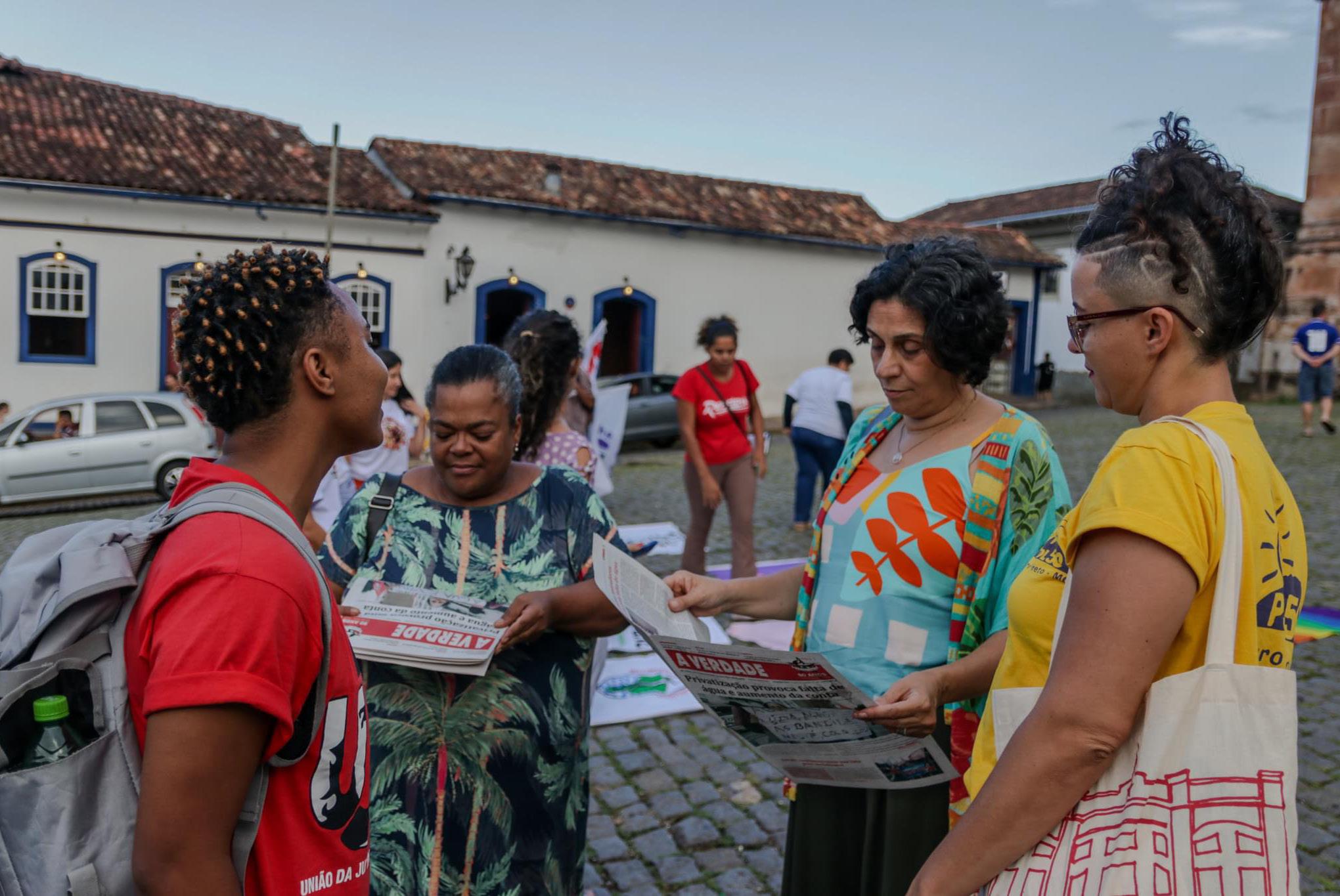 e seja também pelo fato de que os governos das cidades, mas também do estado e do país, seguem coniventes com a mineração predatória, que rebaixa a qualidade de vida da população, enquanto manda as riquezas para grupos que ficam ainda mais ricos às custas do nosso trabalho. Neste ano, então, além de lutar contra as violências que temos visto aumentar na nossa região contra as mulheres, continuamos na luta por um novo modelo de mineração, em que as comunidades, junto com os trabalhadores, possam decidir se querem ou não essa atividade em seus territórios, como é o caso de Antônio Pereira, que precisa ser ouvida e respeitada nos processos de decisão sobre exploração mineral naquele território, além de definir para onde serão destinados os recursos produzidos dessa atividade. Para isso, fizemos atividades tanto em Mariana, no dia 7, quanto um ato em Ouro Preto, ambos muito bem recebidos pela população, que entende que é com luta coletiva que vamos conseguir alcançar nossos direitos.”