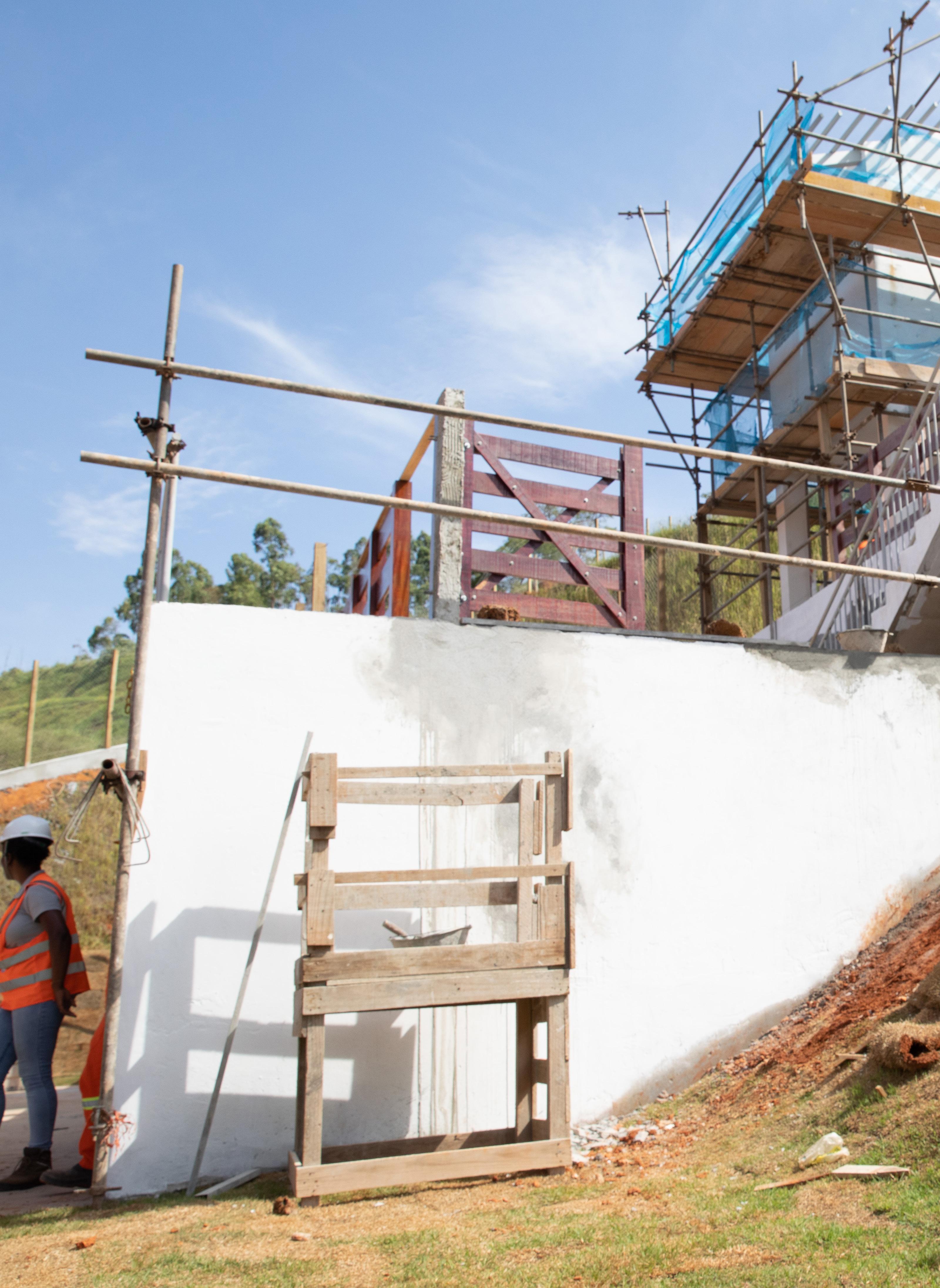 No caminho que leva até ao reassentamento, um caminhão com a frase “tudo no tempo de Deus” no parachoque leva materiais para a obra. Para entrar no “Novo Bento”, como a Renova chama, preciso informar meu nome completo e documentos. O que seria uma visita a um distrito em construção se torna uma burocracia por questões de segurança, me dizem. A rua Raimundo Muniz está logo à frente. A casa onde seu Zezinho espera morar em breve está quase pronta, diz a Renova. Ali eu vejo uma casa bege de portão marrom; ele vê uma reparação que ainda não chegou. Muitos funcionários trabalham sem parar, o barulho da obra é constante. Preciso desviar de buracos nas calçadas, me pego pensando o que o fiscal do reassentamento diria dessas falhas em uma rua ainda sem habitantes. As casas são bonitas e seguem o modelo escolhido pelas famílias, em um projeto inovador de participação popular proposto pela organização, me dizem. A fala institucional é de que todas as moradoras e todos os moradores visitam as casas com regularidade e podem apontar para os defeitos. Questiono se a população vai poder plantar como sempre fez. A resposta é que sim, mas os terrenos íngremes, com pouco espaço no quintal e a falta de água bruta preocupam Seu Zezinho. Minha ida ao reassentamento é uma visita guiada. “O ‘Novo Bento’ terá a primeira estação de tratamento de água e esgoto de Mariana” e