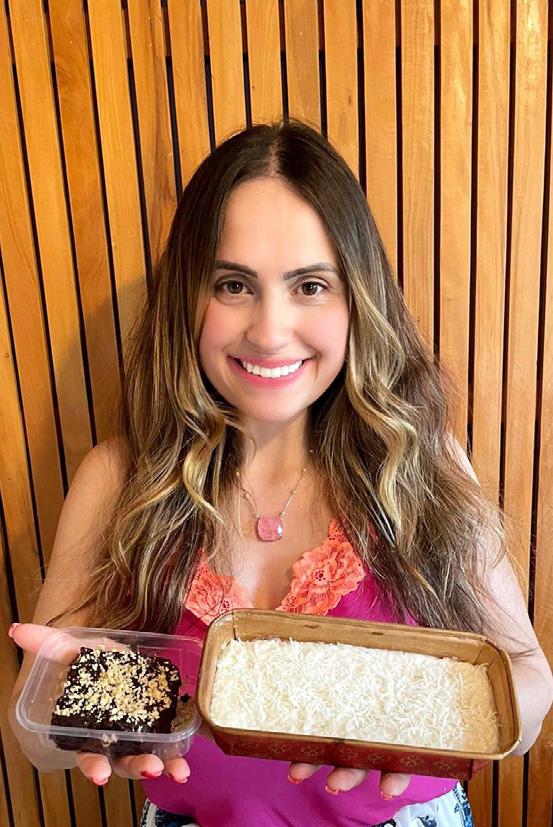 com coco, cookie, briga deiro de nozes, bombons recheados, creme patissie re, brownie, cocada branca, e pirulitos de chocolate. Na doceria, é possível adqui rir produtos disponíveis a pronta entrega, com um cardápio diário, ou realizar pedidos sob encomenda. “Fazemos de acordo com o que o cliente pede, poden do ser adicionado frutas, castanhas, entre outros”, conta.