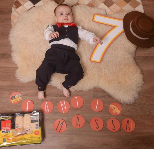Mariana Cavalli e Rafa el Valentim, casal gaúcho de Cidreira, no Rio Grande do Sul, recentemente resolveram inovar no mêsversário de seu filho, o bebê Santiago. Cada mês era escolhido uma temá tica relacionada ao nome da criança, como “croisSanti” e "paris Santi germain". O sé timo mês de vida do peque no Santi, em 23 de setembro, coincidiu também com uma data muito importante aos sulistas: a semana da farrou pilha. No mesmo momento, a mãe Mariana já sabia que pre cisaria ser algo relacionado aos gaúchos e ao churrasco.