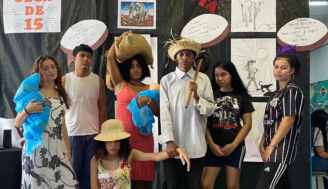 Segundo Ana Flávia, pro fessora da escola, desse modo foi possível trabalhar a te mática da auto afirmação da cultura brasileira. “Todos os docentes da escola propuse ram aos alunos trabalhos em suas áreas e o resultado foi in crível: teatro e dança sobre o papel do indígena como herói nacional no Romantismo, re leituras de obras regionalistas do Modernismo Brasileiro, exposição de Tangram e Ori gamis explorando conceitos matemáticos, releituras de obras de arte, móbiles com