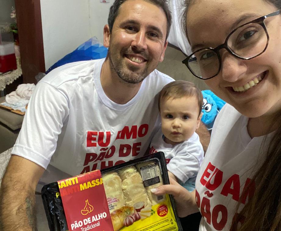 lhor pão de alho como petisco, e assim nasceu o ‘Santi Massa’, ligando todos os pontos. Sou marketeira, então adoro essa função. Nunca quis mesver sários comuns, acho que meu gurizinho merece mais sem pre!”, explica Mariana em en trevista para o Atual Não demorou muito para que a foto viralizasse e chegas se até a empresa, que enviou um kit personalizado para a família, com pães “Santi Mas sa” personalizados, produtos, camisetas e uma pelúcia para o neném. A família, como todo bom gaúcho, é fã de churrasco e pão de alho, e ficou surpre sa com os recebidos: “A gente adorou o carinho e a forma na qual eles fizeram o marketing em cima da situação. Agrade cemos demais essa ação!”