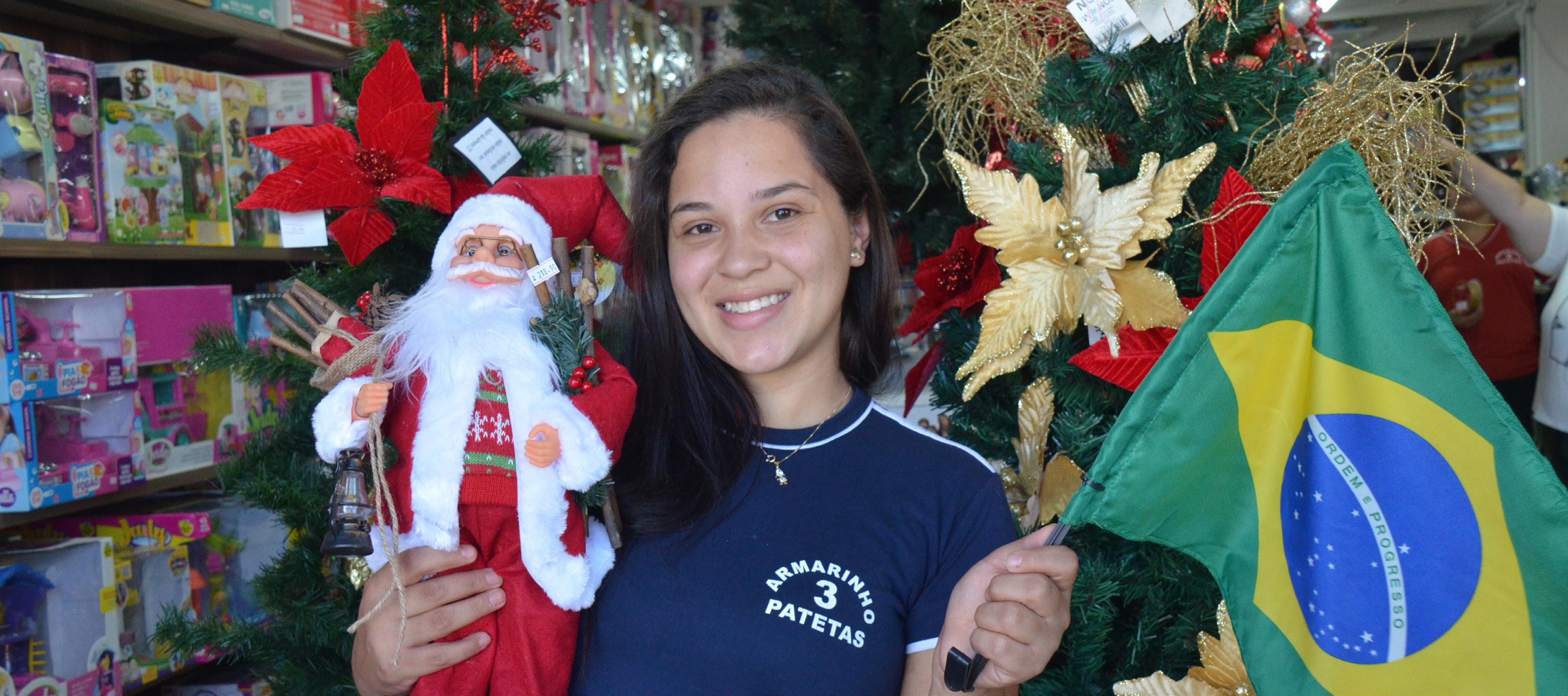 Letícia Godoy é funcio nária da loja Calçados São Lucas. Segundo ela, lá são comercializadas camisetas do Brasil e chinelos com a bandeira. No ano da Copa, a jovem explica que foram investidos também em cal çados, peças de roupa e acessórios com as cores da bandeira nacional.
