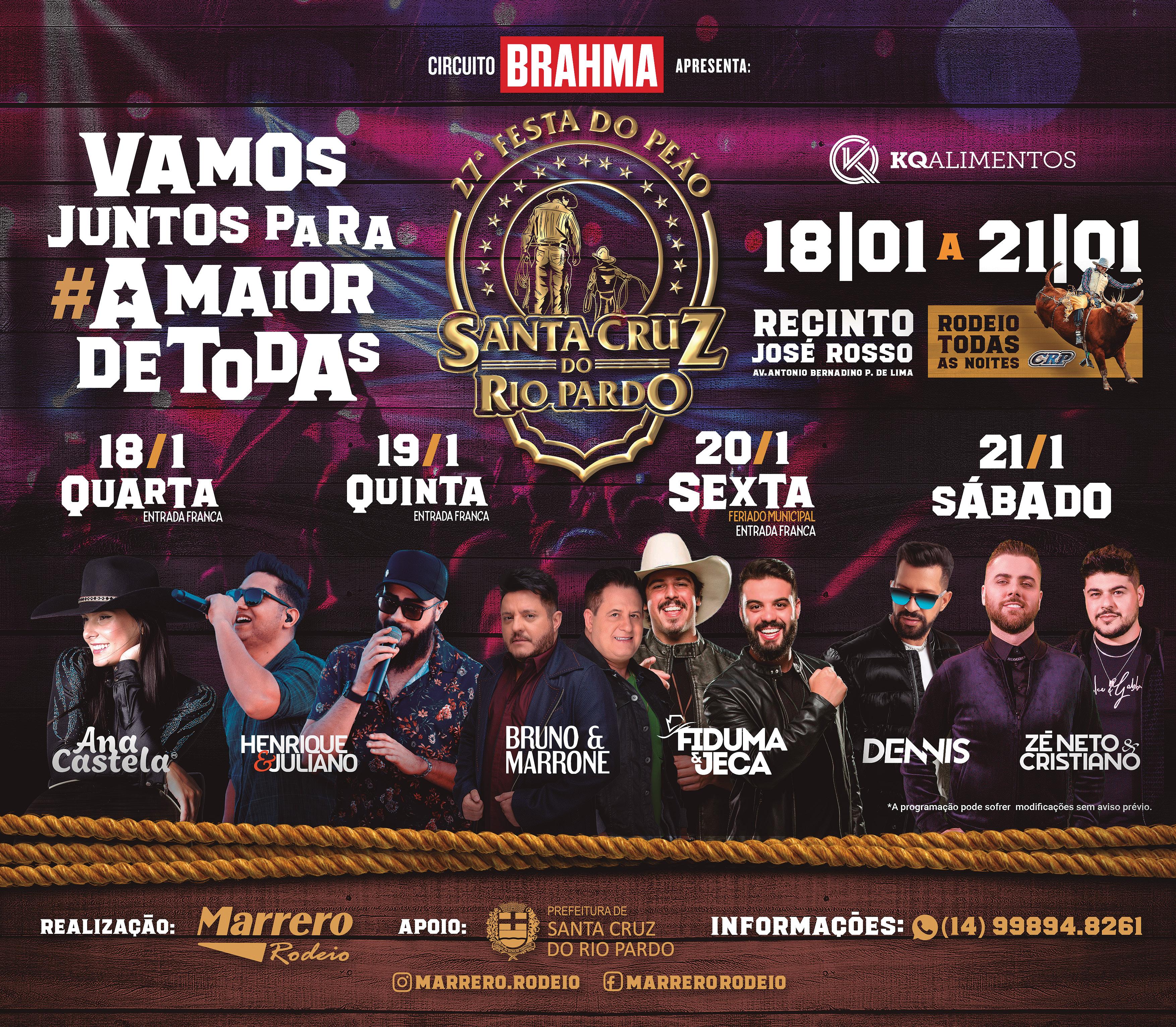 A Prefeitura de Santa Cruz do Rio Pardo em parceria com outros setores da cidade, programou uma agenda para a população do município em comemoração ao aniversário de 153 anos da cidade. As atividades se iniciaram na última segunda-feira, 09, e vão até o começo do próximo mês, envolvendo diversos eventos por diferentes locais da cidade. Entre alguns dos destaques, estão a Festa do Peão de Boiadeiro, e a famosa corrida de boia. Confira a programação durante de janeiro até o dia 05 de fevereiro: