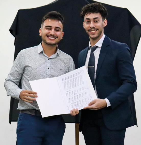 Renan Alves recebe o termo de posse das mãos do advogado Lucas Manzo, assessor jurídico da instituição